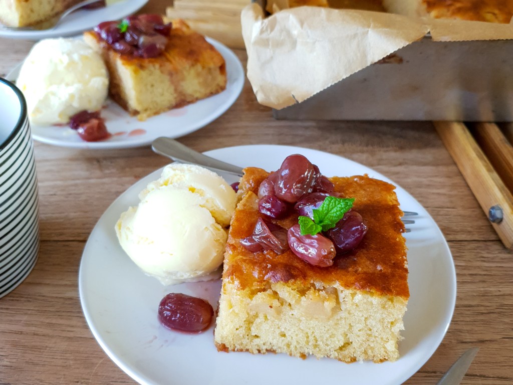 Zodra de cake gaar is snij je hem in plakken en seveer je hem met een bolletje roomijs en een grote lepel druivensaus.