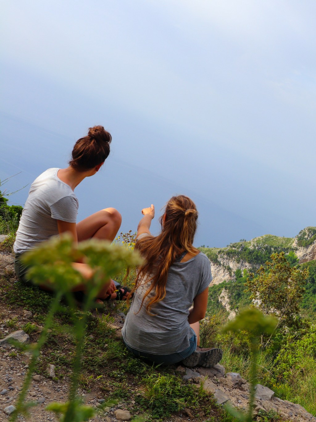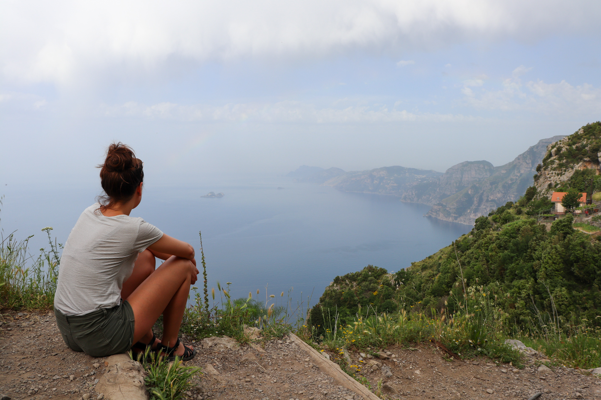 We drinken koffie bij een klein café, waarna we pas aan de officiële route beginnen. ‘Il sentiero degli dei’ ofwel ‘het pad van god’ is de route die we vandaag gaan wandelen. De weg is op veel plaatsen breder dan het stuk die we voor de koffie gelopen hebben. Wanneer de zon hoger aan de hemel komt te staan komen we steeds meer andere wandelaars tegen. Het is de populairste wandelroute in deze omgeving. Wat wel begrijpelijk is. Om iedere hoek heb je weer een schitterend uitzicht. Soms alleen over de zee of je ziet een aantal kleine huizen met hun eigen moestuin en citroengaard. Wanneer je iets verder loopt zie je een schattig dorpje of kun je zo ver kijken dat je zelfs het eiland Capri ziet liggen.