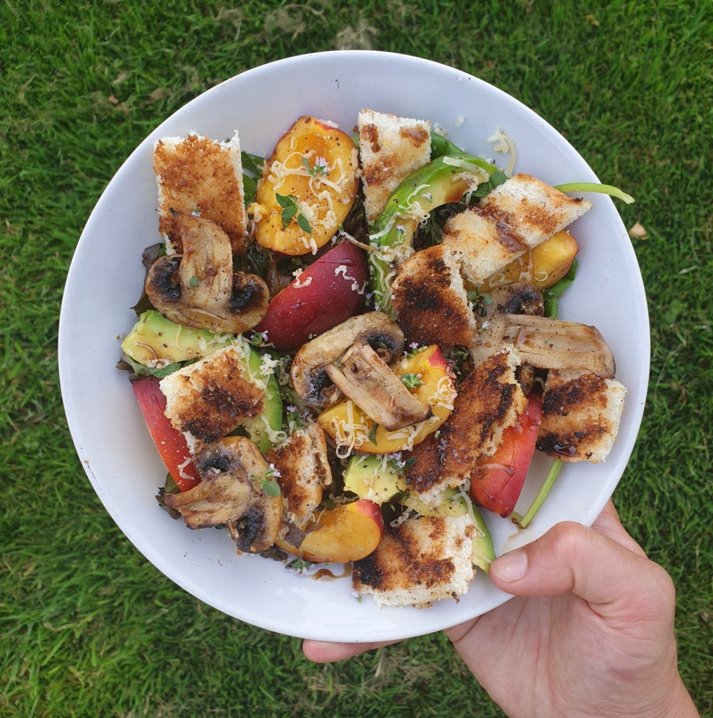 Ideeën voor nieuwe recepten komen soms op de gekste momenten. Bijvoorbeeld wanneer je geen zin hebt om boodschappen te halen en je het moet doen met de spullen die je in huis hebt. Een paar oude bolletjes grillen voor croutons en wat groente en fruit die nog net kunnen. Zo heb ik deze lunchsalade ‘ontdekt’. Met een beetje geluk kun je dus iets heel lekkers maken.