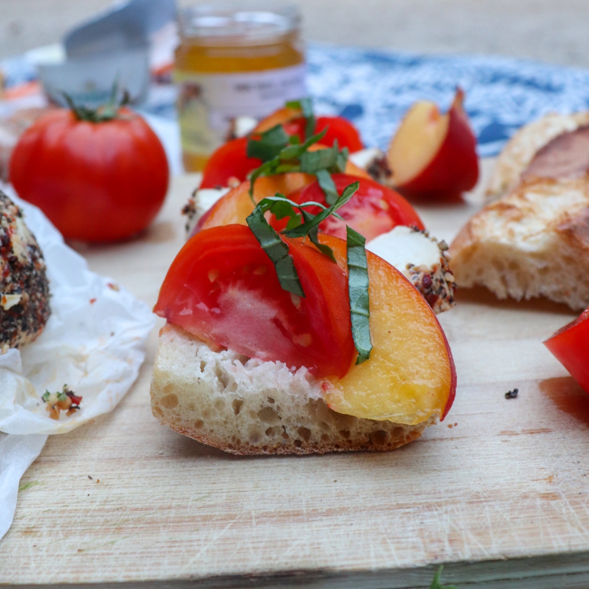 Snijd de stokbroden doormidden en snijd de perzik en tomaten in partjes. Smeer het stokbrood in met de geitenkaas. Doe er daarna de honing op. Verdeel de partjes tomaat en perzik over het stokbrood en strooi als laatste de basilicum eroverheen.Zo heb je een heerlijk stevige lunch met alleen maar verse en gezonde ingrediënten.