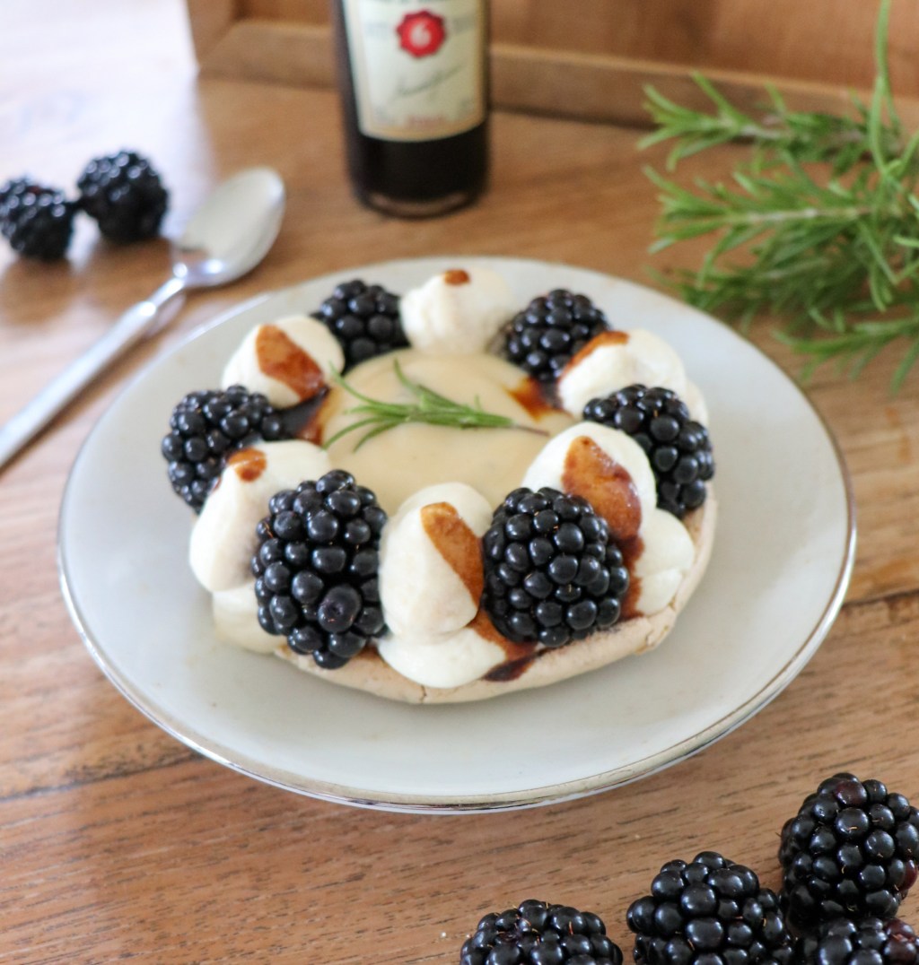 Kies zes macarons uit en leg die met de bolle kant naar onderen op gebaksschoteltjes. Doe de amandelmousse in een spuitzak en spuit zes gelijke toefjes op de rand van elke macaron. Zet tussen deze zes toefjes bij iedere macaron zes bramen. Vul het midden op met de rozemarijn-banketbakkersroom. Druppel over iedere macaron een halve eetlepel balsamico siroop en versier de macarons met een takje rozemarijn of gebruik de andere macarons als dekseltje erbovenop.