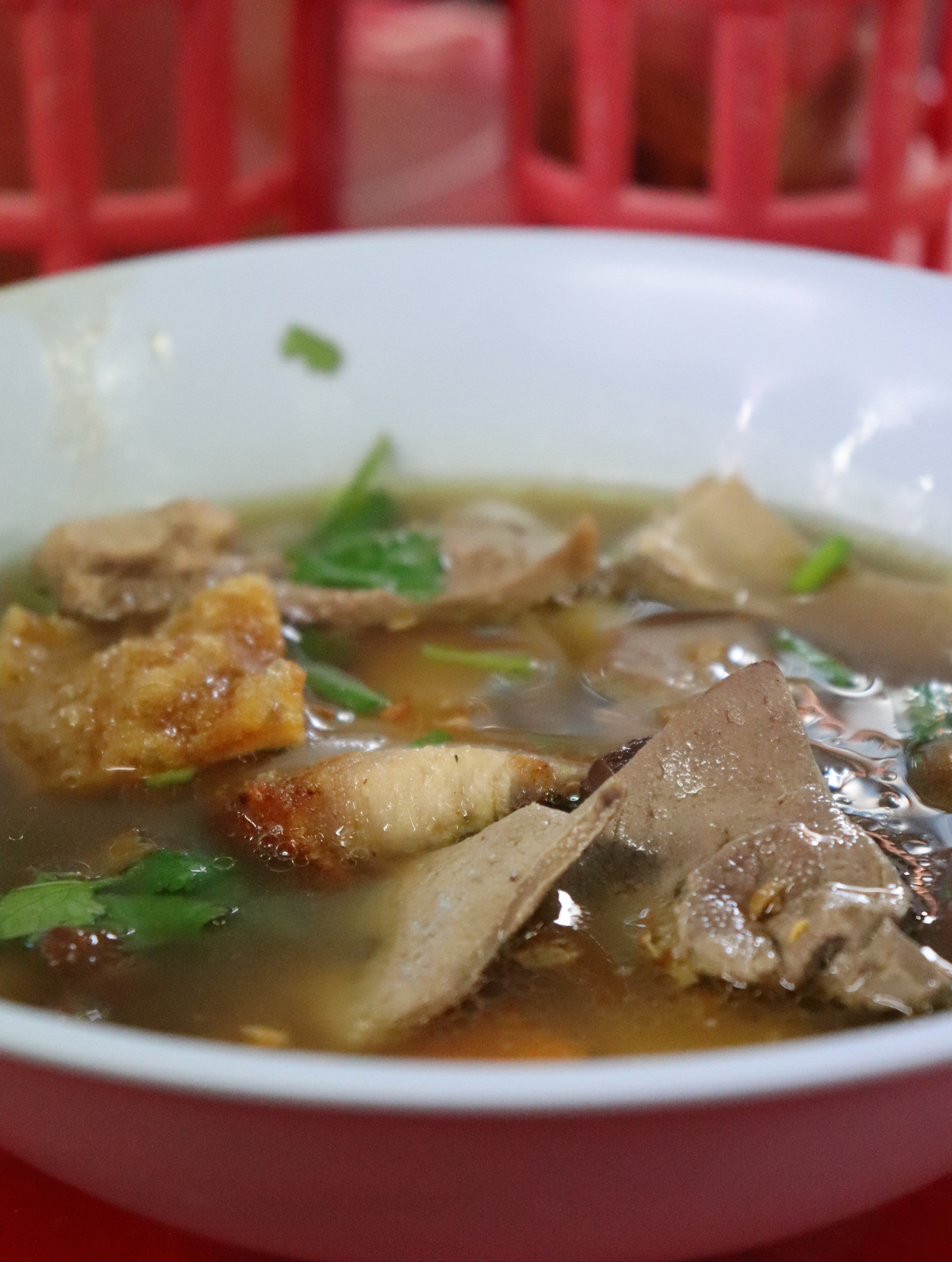 Ik kan echt wel dagen door chinatown kunnen slenteren. Allemaal kleine winkeltjes in smalle steegjes. Ze verkopen er echt van alles. Het is jammer dat mijn koffer al tot de nok toe voel zit want anders . . . anders kun je je geluk hier wel op. Ook hier zijn een hele hoop foodkraampjes, ze verkopen worstjes op stokjes, vispannenkoeken en gezouten krab. Ik ga voor de noedelsoep met alles erop en eraan. Dat betekent een vulling van gefrituurde zwoerd, rundermaag, longen, lever en hart. Ik was niet heel optimistisch toen ik mijn soep kreeg, maar ik wil alles proberen en het was best wel lekker.