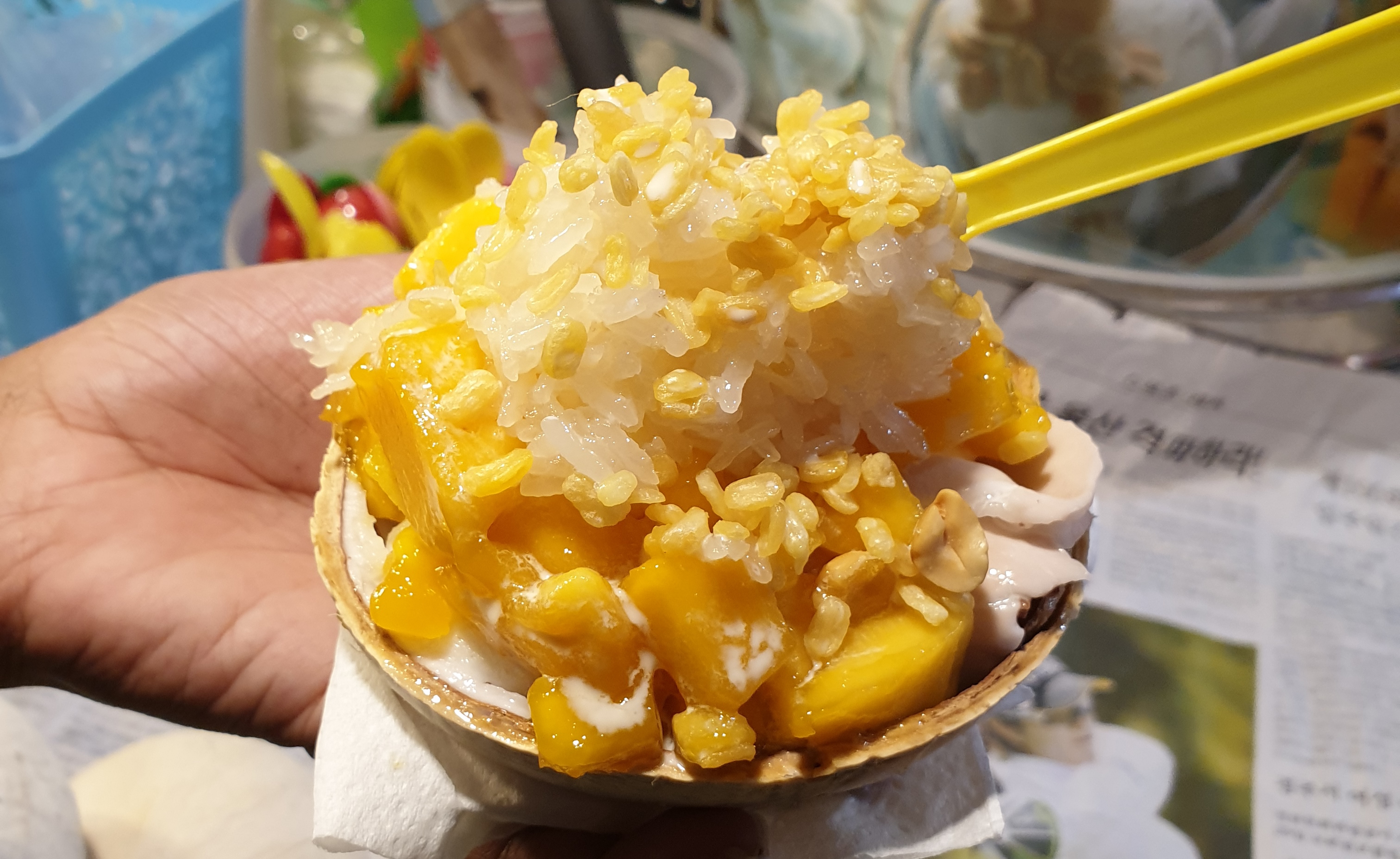 De gewone mango sticky rice is al heerlijk, maar met kokosijs is het helemaal het einde. Je komt het niet zo heel vaak tegen meestal is het alleen mango sticky rice, toch vind je in Bangkok op de grote markten zoals de trainmarket wel een kraampje waar ze de mango sticky rice met kokosijs verkopen.