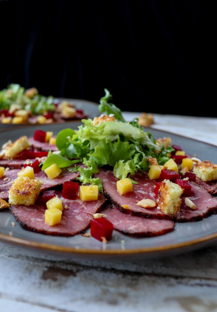 Het kost wat tijd voor je deze carpaccio kunt eten maar dan heb je ook wat. Een heerlijke combinatie van zacht gerookt vlees met zoete mango, het bittere van koffie en aardse bietjes. Perfect om tijdens Kerst of Oud en Nieuw aan je gasten te serveren.