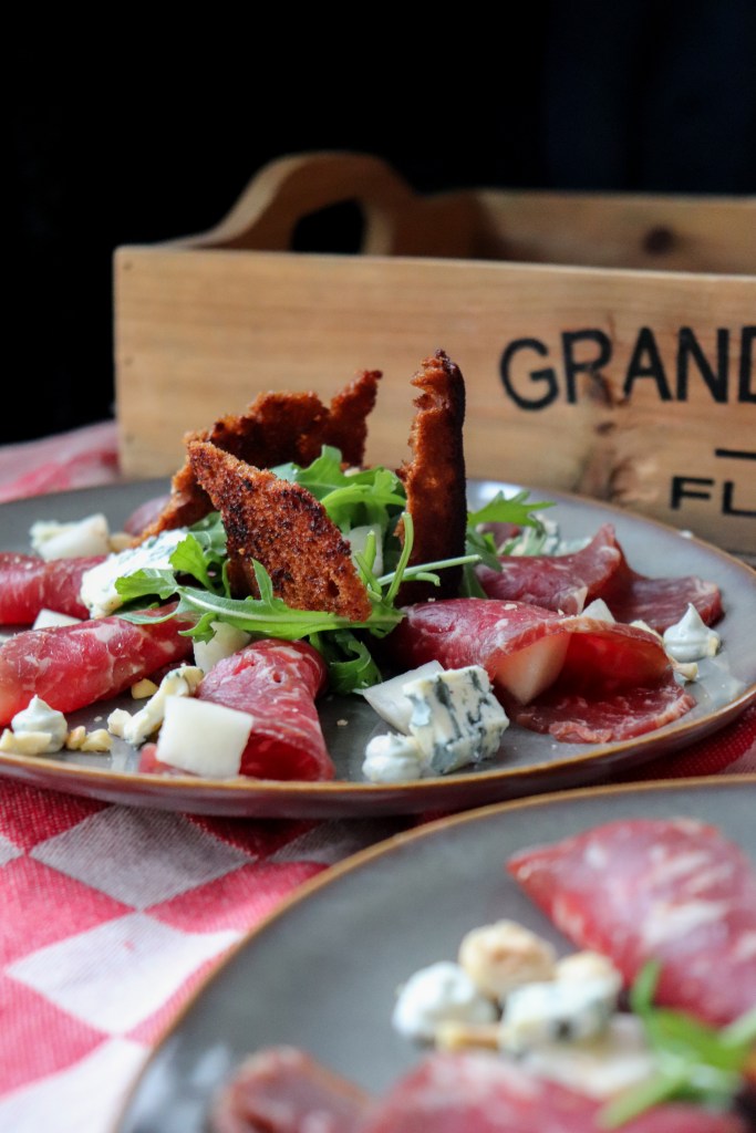 Deze carpaccio is een combinatie van sterke smaken. De combinatie van de rook en gorgonzola gaan heel mooi samen met het zoete van de peer en de kruiden van de ontbijtkoek. Vroeger maakte mijn moeder regelmatig een salade met gorgonzola, peer en ontbijtkoek wat ik altijd heerlijk vond. Lekker om te maken voor een speciale gelegenheid.
