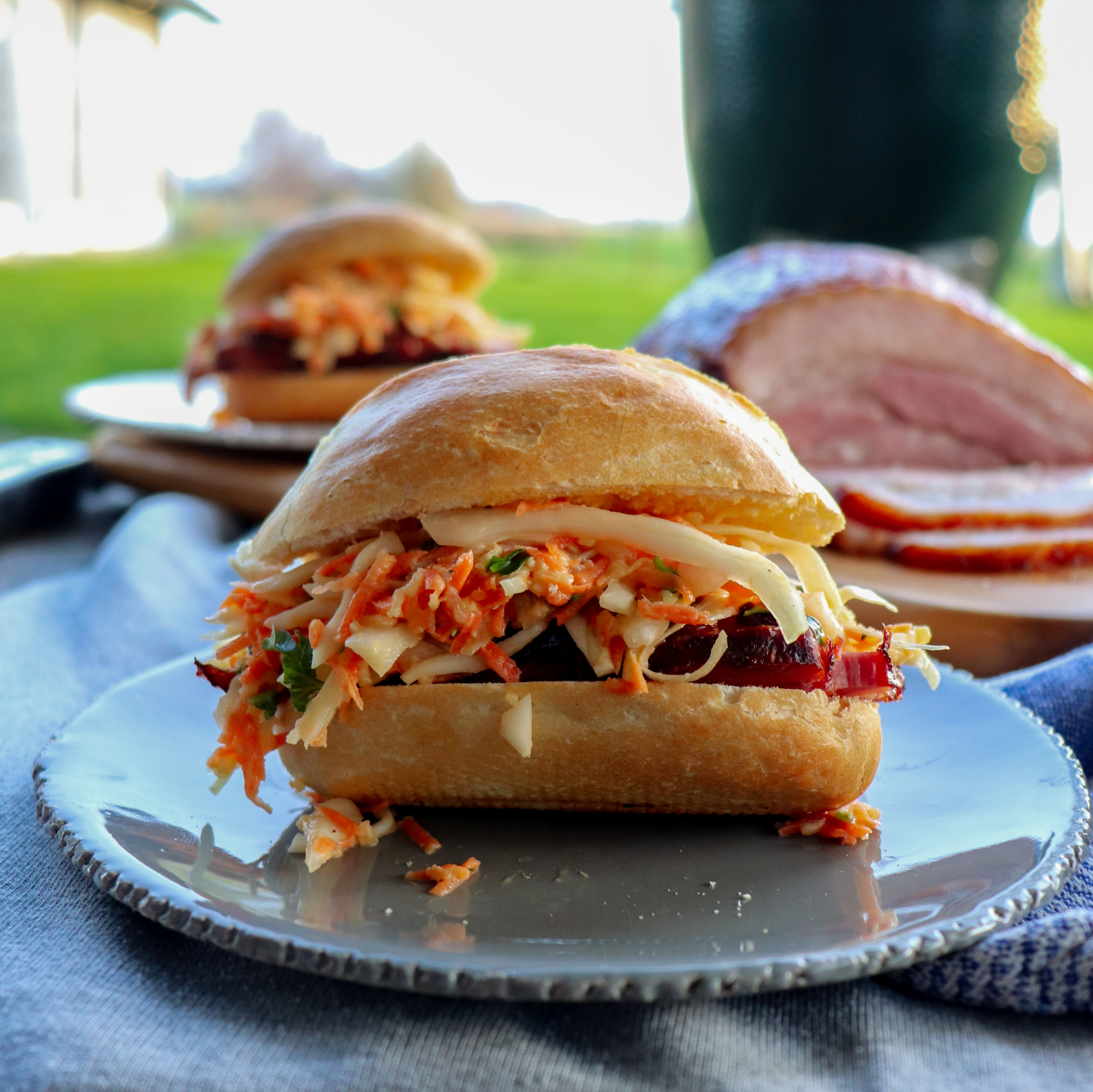 Serveer de in plakjes gesneden buikspek in een broodje met een beetje witte kool salade.