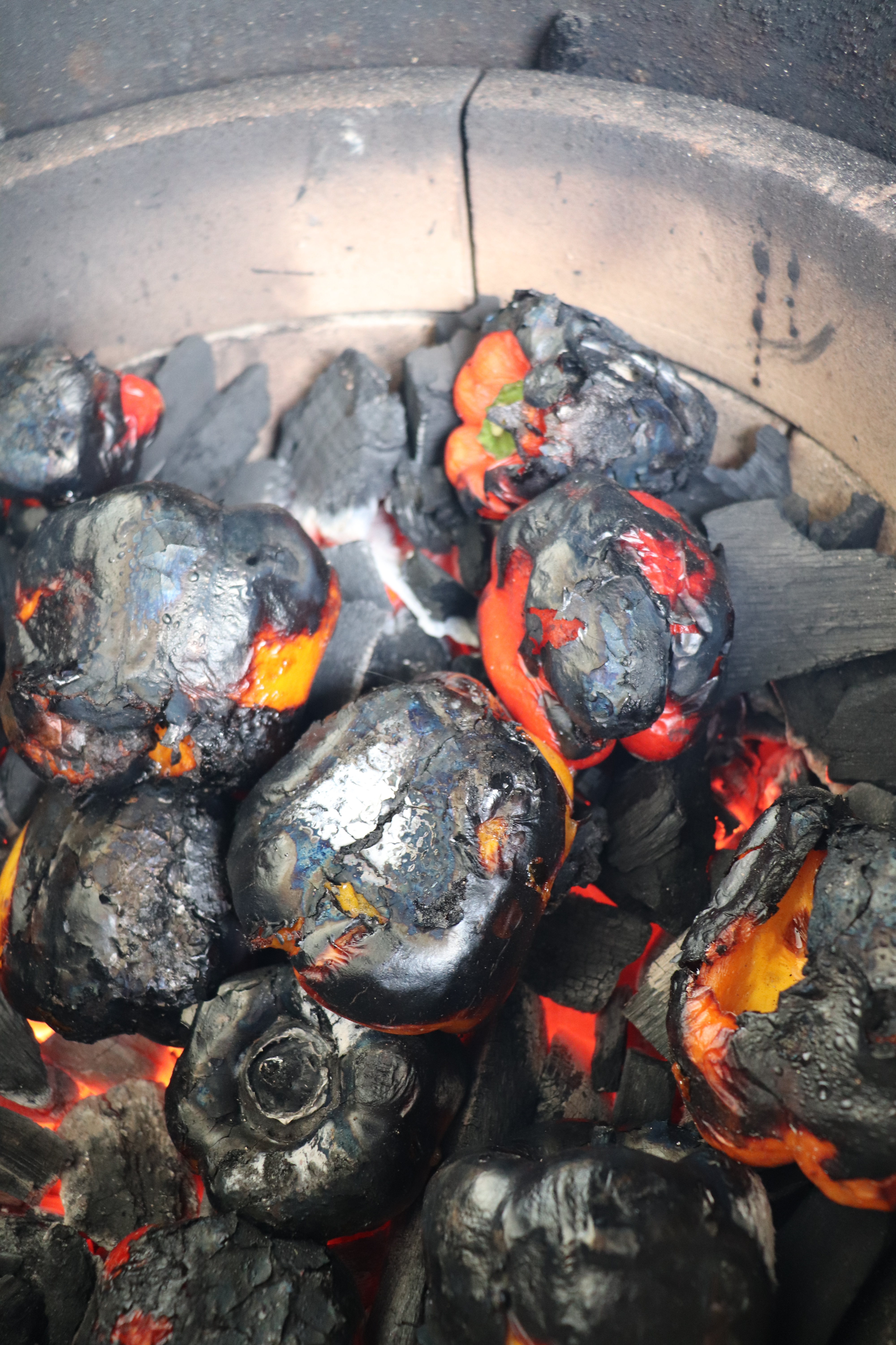 Zet de Green EGG aan zonder het rooster of confEGGtor er in. Wanneer de houtskool mooi groeit, maar niet meer brand. Doe de paprika’s in de barbecue en draai ze regelmatig om zodat het velletje rondom helemaal zwart is en hij niet verbrand. Zodra ze zacht en zwart zijn haal je ze uit de barbecue en laat je ze rustig afkoelen.