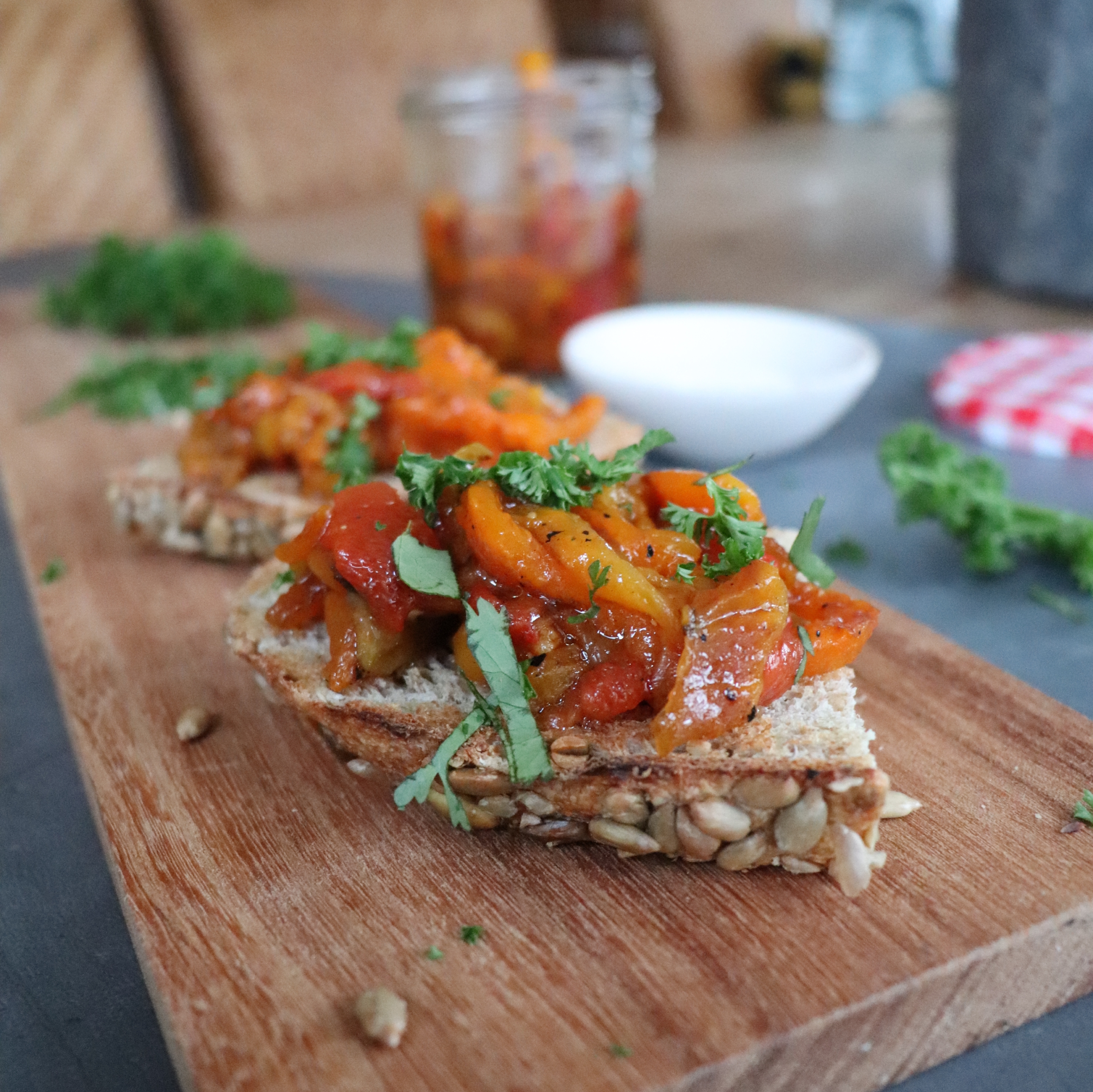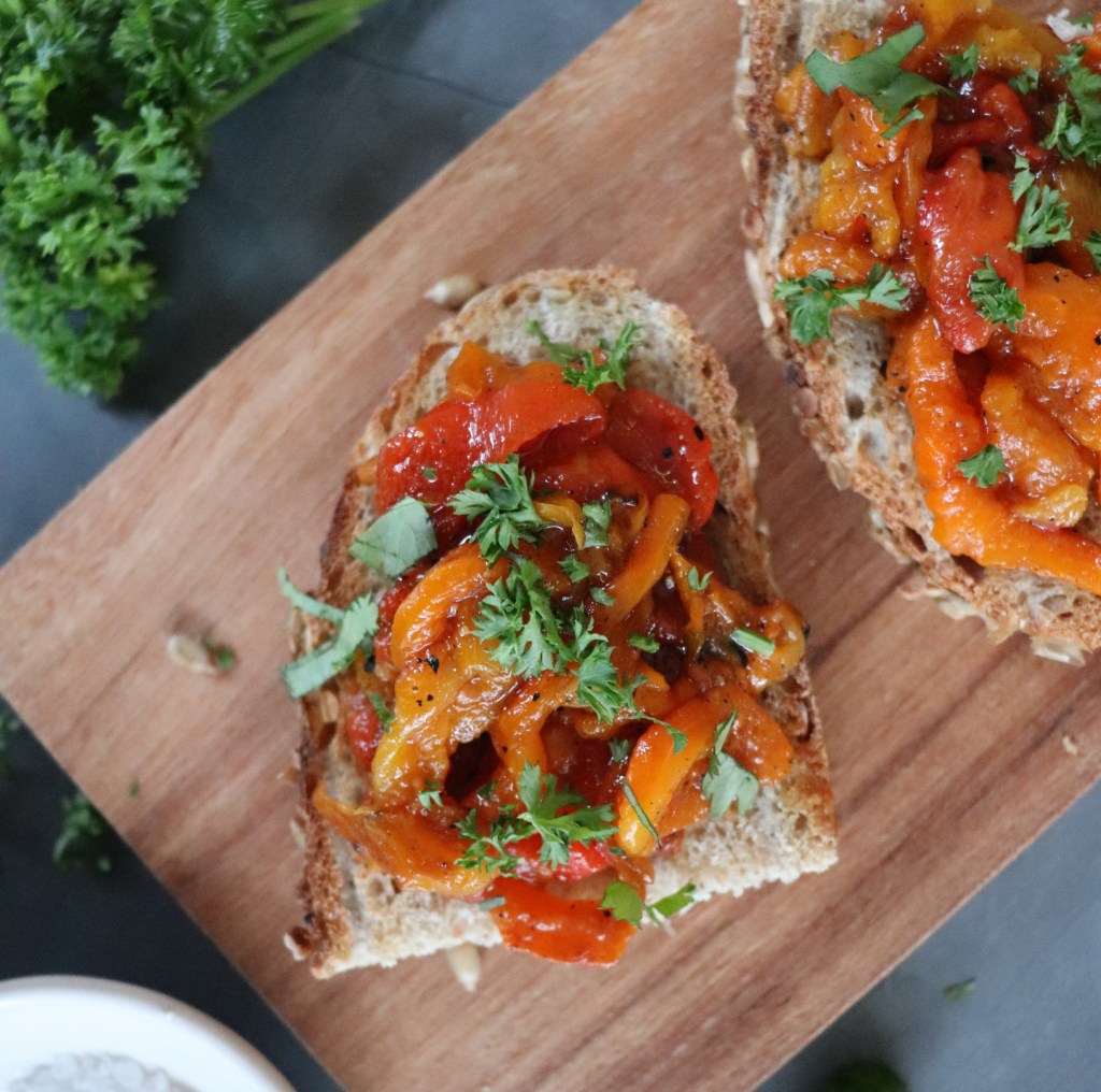 Rooster de dikke boterhammen en verdeel de paprika mix over en garneer het met verse kruiden.