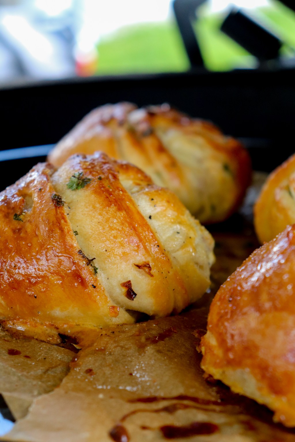 Rol het deeg uit tot een lange rechthoekige lap. Smeer de lap in met roomboter. Snijd de ui, knoflook en peterselie fijn en verdeel het over de lap. Vouw 1/3 naar binnen en vouw daarna 1/3 er weer overheen. Snijd het deeg nu in 8 gelijke lange banen en leg een knoop in het deeg. Verdeel de deegknopen over de bakplaat. Meng de eidooier met 1 eetlepel water. Smeer de deegknopen in met het eigeel.