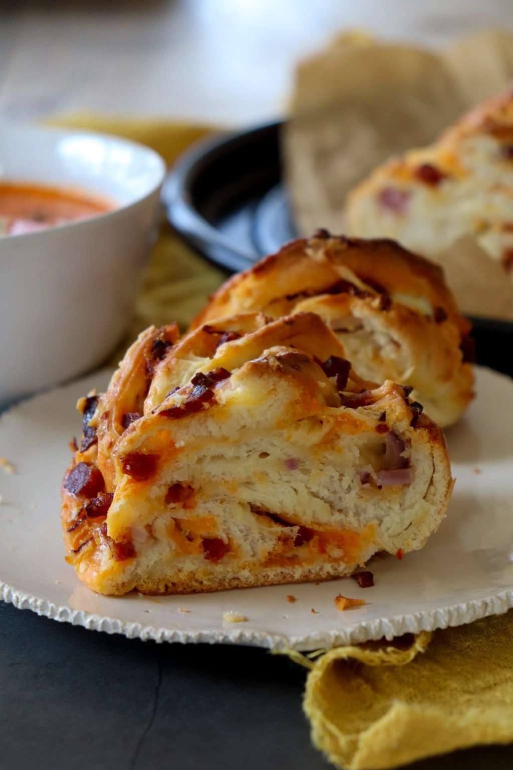 Rol het deeg uit tot een lange rechthoekige lap. Smeer de lap in met roomboter. Snijd de ui en chorizo fijn en verdeel het met de geraspte kaas over de lap. Rol het deeg op en snij het over de lengte doormidden. Leg de doorgesneden kant naar boven en sla de twee stroken om elkaar heen tot het vlechtbrood de juiste vorm heeft en leg het op een bakplaat. Leg er losjes een stuk vershoudfolie overheen en laat het een uur rijzen of tot het in formaat verdubbeld is.