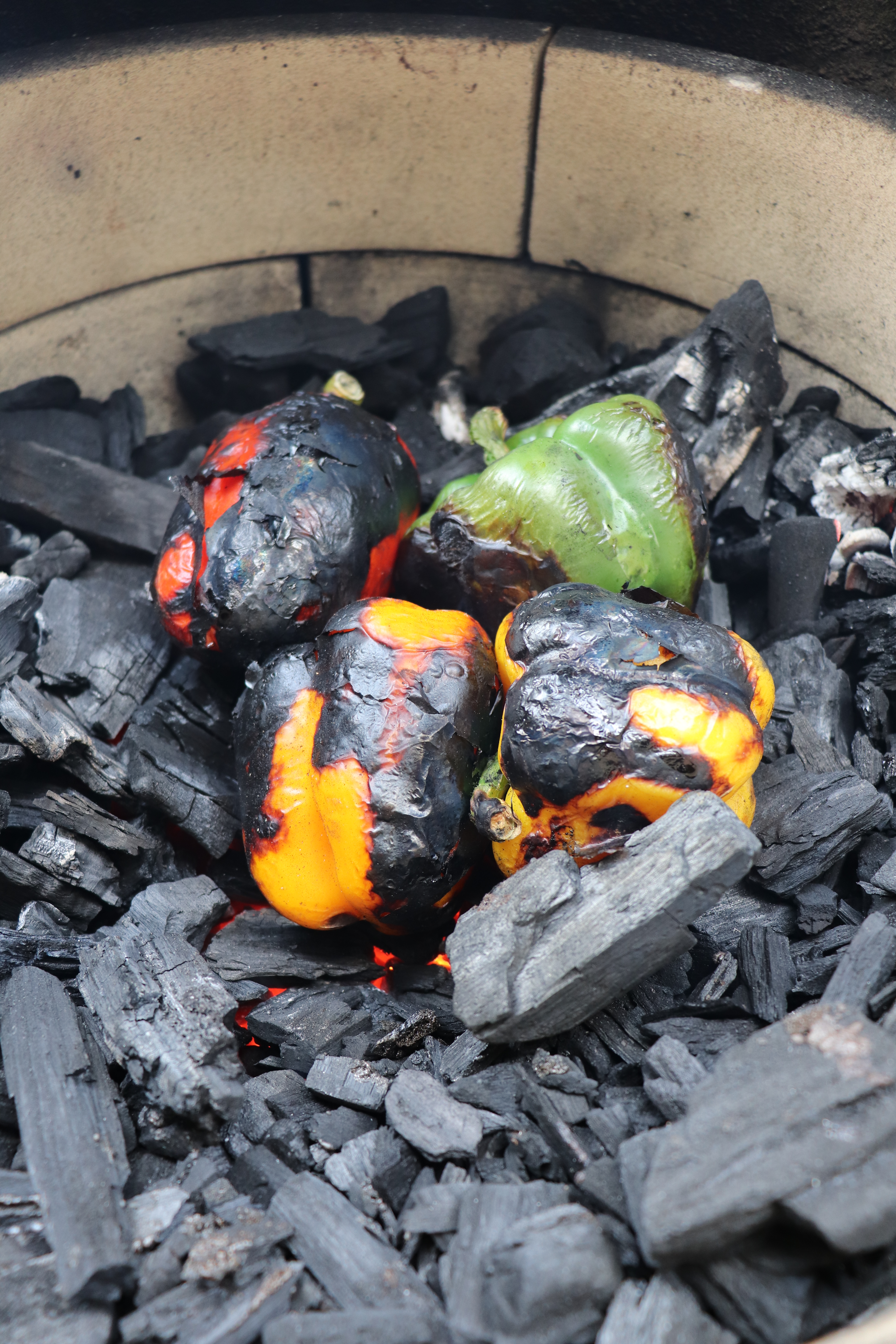 Zet de Big Green EGG aan. Zodra het vuur goed brand leg je de paprika’s erin. Draai de paprika’s regelmatig zo dat het velletje rondom zwart wordt maar het vruchtvlees niet verbrandt. Zodra de paprika’s rondom helemaal zwart zijn, haal je ze uit de Big Green EGG en laat je ze rusten in een afgedekte schaal.