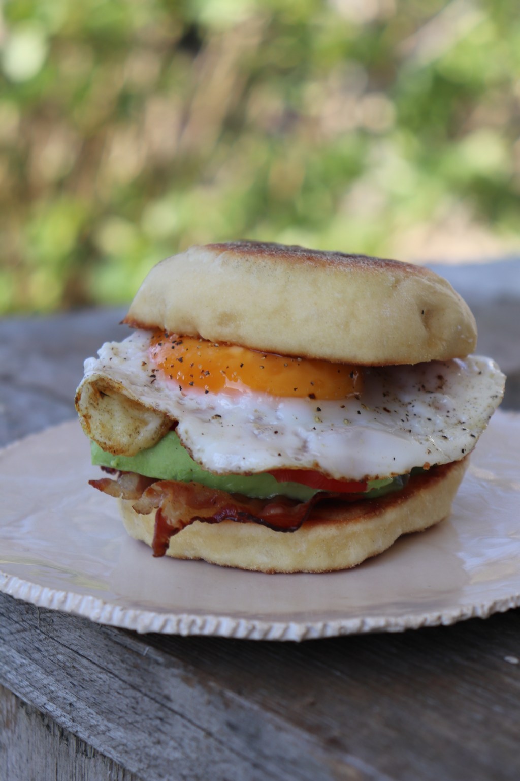 Eerst een kant van de muffin. Daar doe je de avocado- en tomatenpartjes op en daarbovenop de bacon en het ei. Bestrooi het ei met wat zout en peper en nadat je de overgebleven kant van de muffin erop hebt gelegd, kan het ontbijt beginnen!