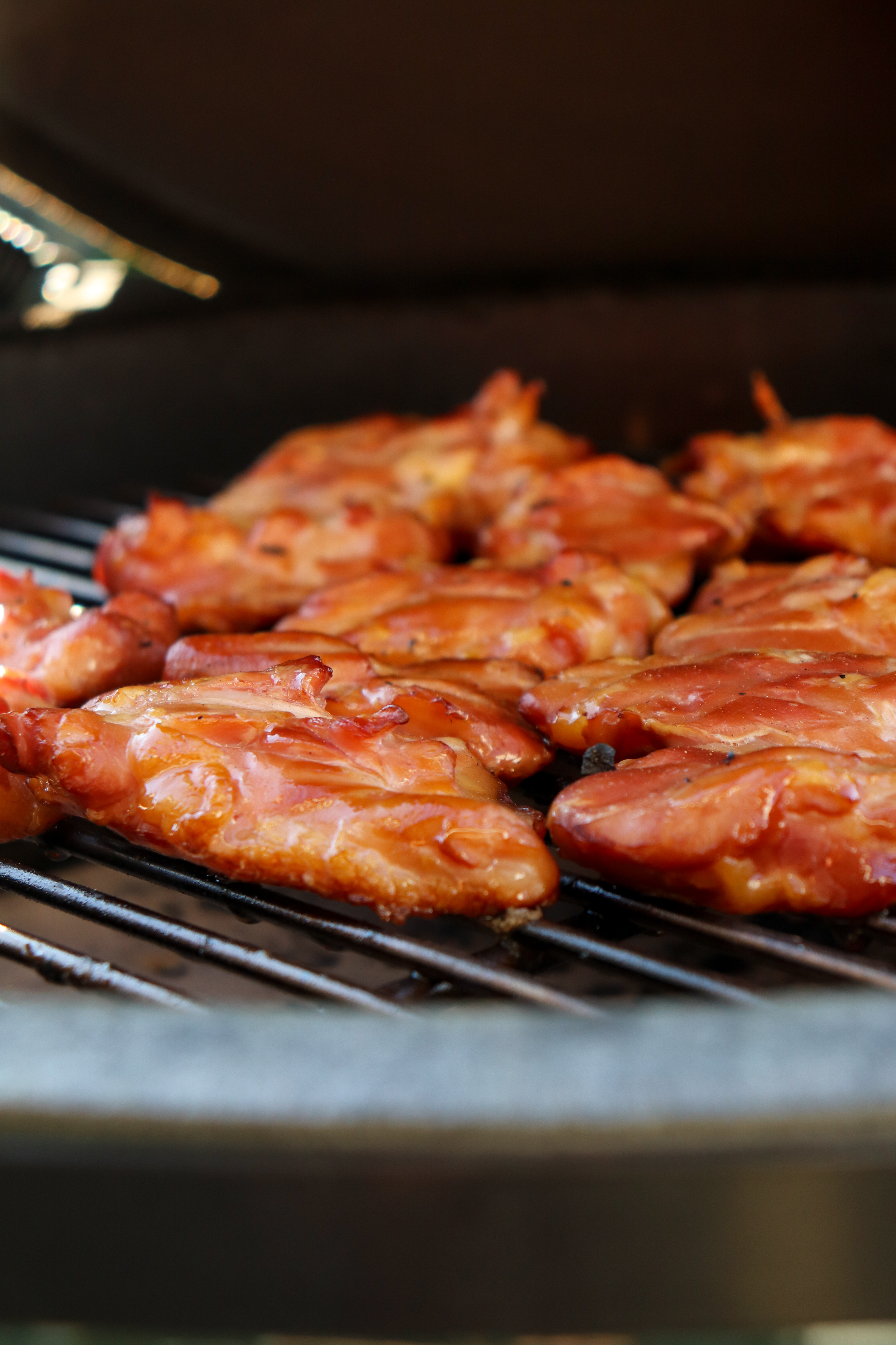 Breng de temperatuur van de Big Green EGG naar 100 graden en gooi er een handje rooksnippers in. Leg de kippendijfilets op het rooster. Gaar de kip tot een kerntemperatuur van 70 graden.