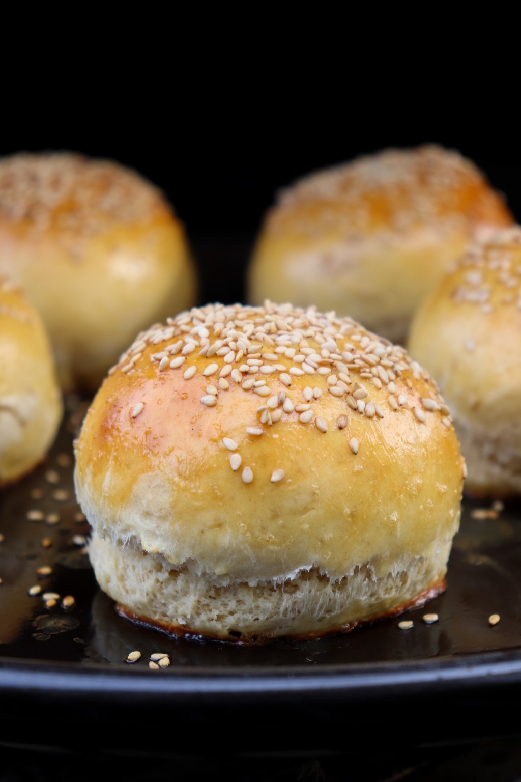 Haal het deeg uit de kom en druk de lucht eruit. Verdeel het deeg in 10 gelijke bolletjes en maak ze mooi rond. Verdeel de bolletjes over een bakplaat met genoeg ruimte ertussen. Smeer ze in met de overige zonnebloemolie en strooi de sesamzaadjes over de bolletjes en leg een vochtige theedoek over de bolletjes. Laat ze nog een een uur rijzen.