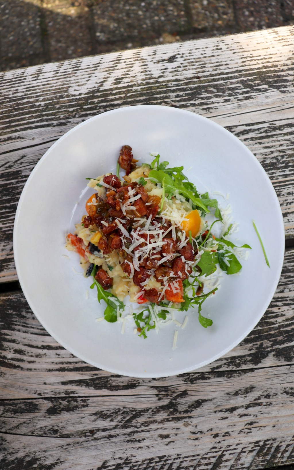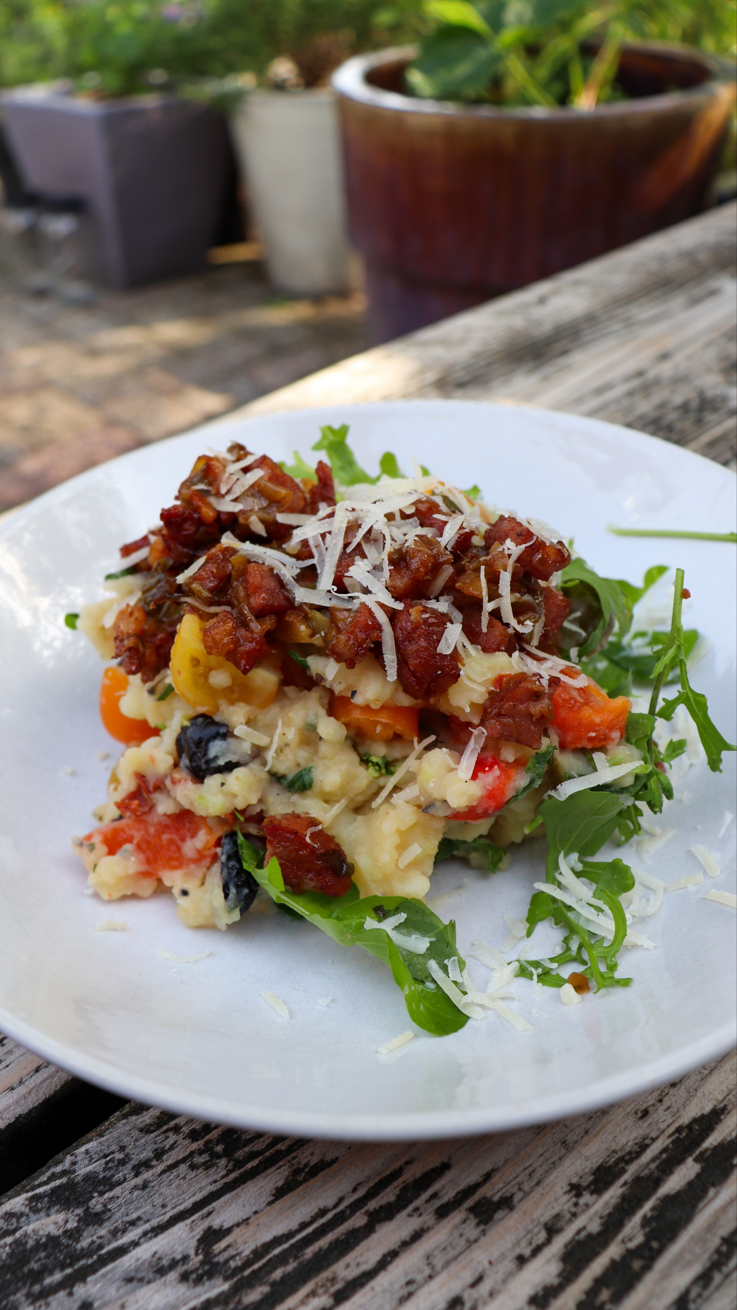Snijd daarna de cherry tomaten, paprika’s en olijven in stukjes en roer die samen met de rucola en de gebakken ui door de aardappelpuree.