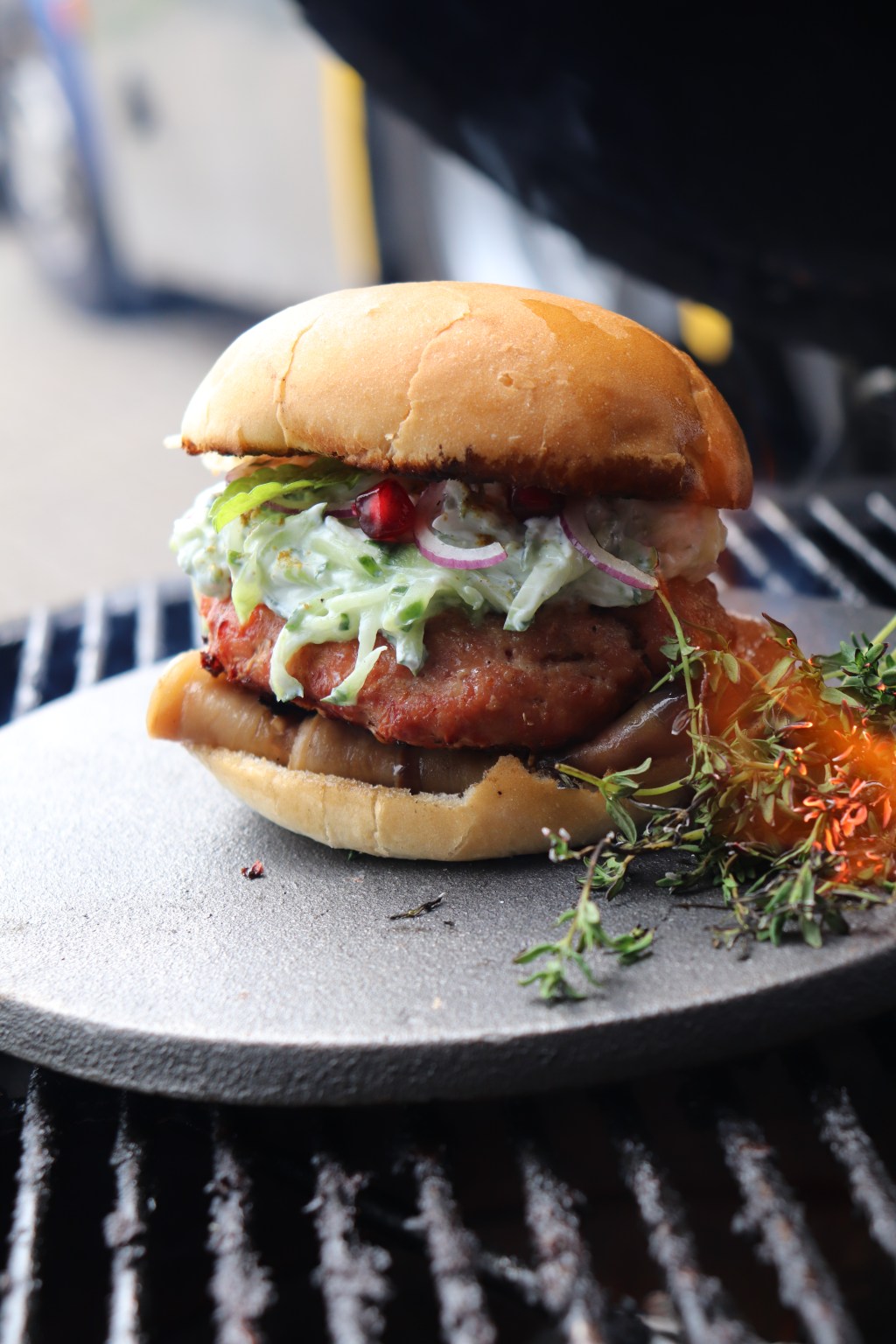 Een super lekkere sappige hamburger met wat extra pit door het komijnzaad, heerlijk romig door de tzatziki en de gegrilde aubergine.