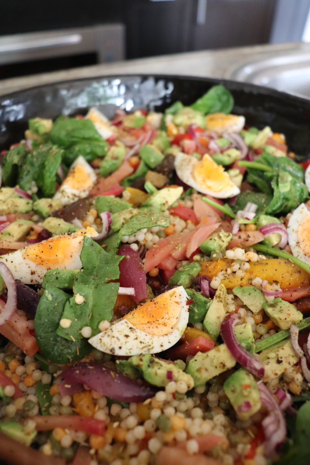 Verdeel de bietjes, avocado, en ei over de couscous salade. Heerlijk om te eten met gegrilde vis en paprika-feta dip.