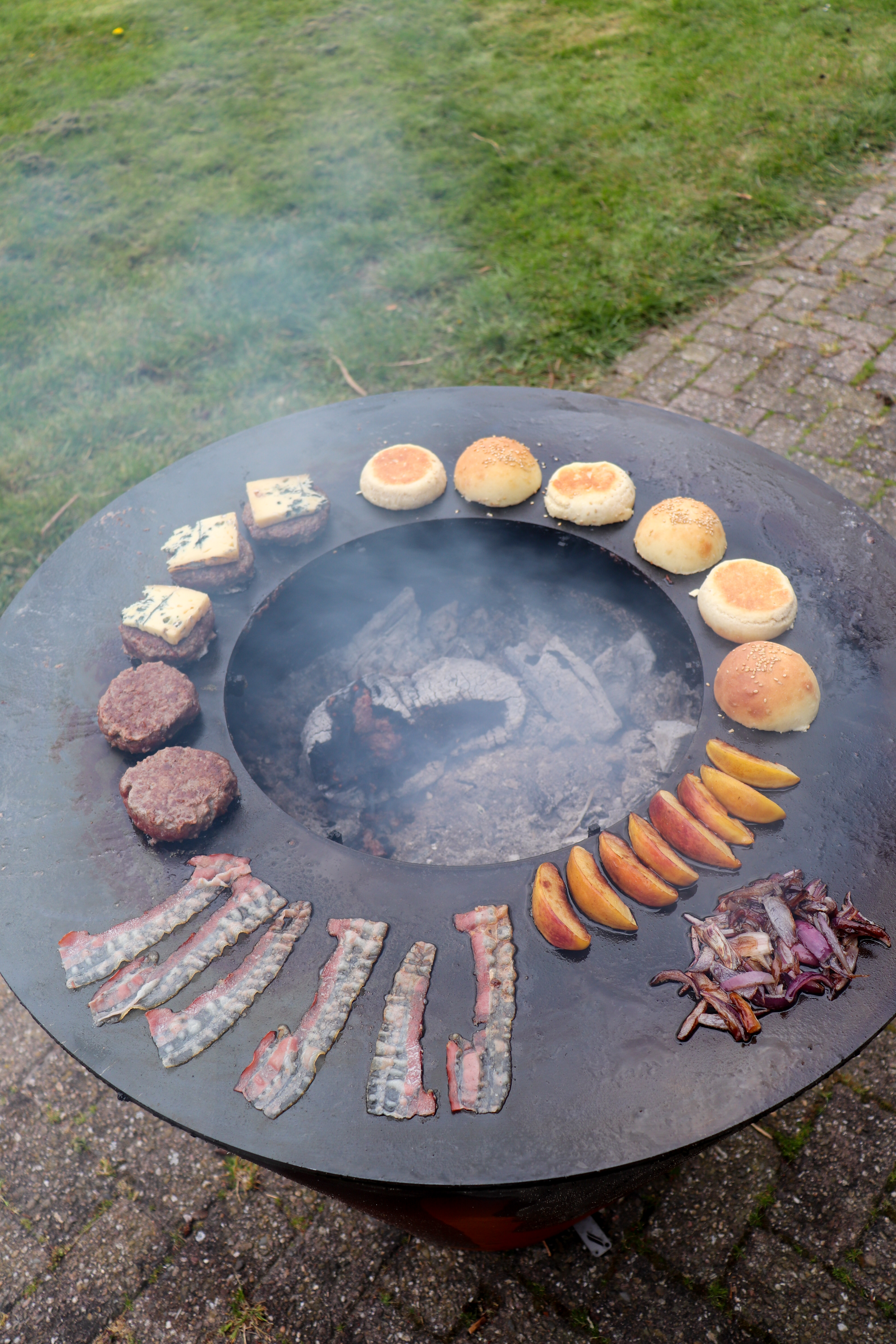 Snijd de rode ui in ringen, de nectarine in partjes en leg deze samen met de burgers op de Arteflame en draai de ui en nectarine regelmatig om.