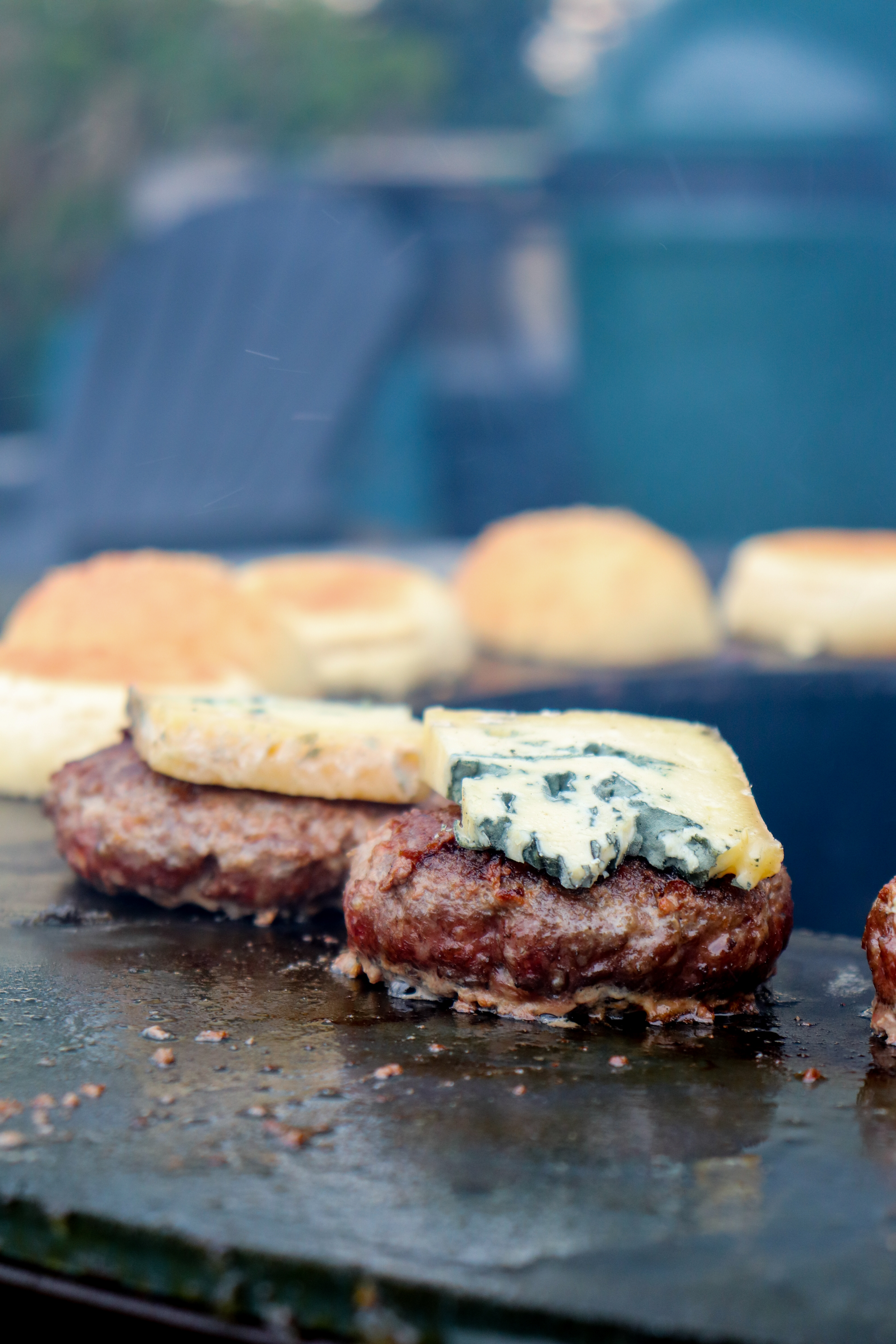 Wanneer je de hamburgers gedraaid hebt, verdeel je de gorgonzola over de hamburgers. Leg de bacon nu ook op de barbecue en bak deze krokant.