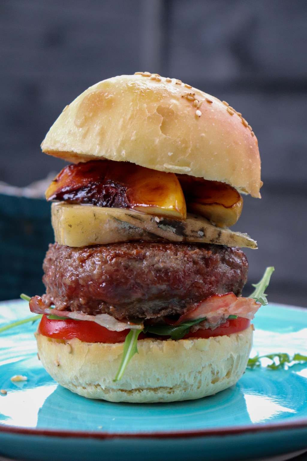 Zodra de hamburgers gaar zijn, haal je alles van de barbecue en kun je het broodje burger opbouwen. Eerst een beetje rucola en tomaat op de onderste helft van het broodje, daarop de burger met gorgonzola, de bacon, daarna de ui en de nectarinepartjes en als laatste het kapje van het broodje.