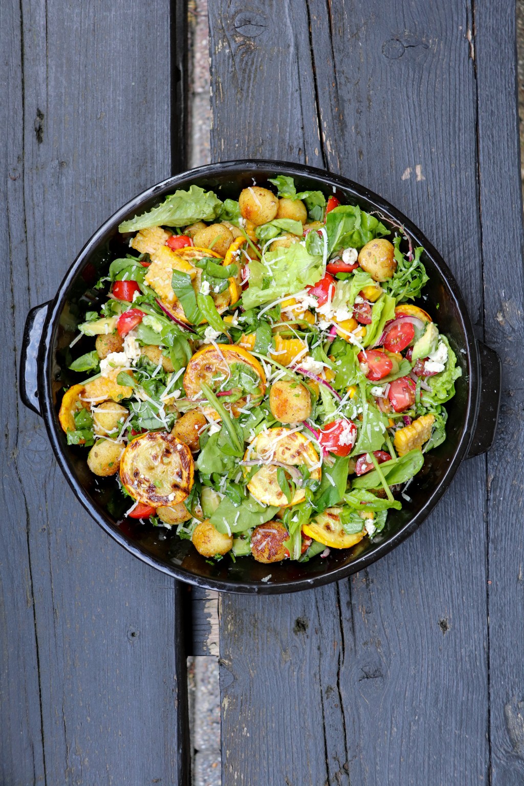 Zodra het water in de grote pan kookt, voeg je de gnocchi toe. Zet een koekenpan op het vuur met de roomboter erin. Zodra de gnocchi begint te drijven schep je ze van de pan in de koekenpan en bak je ze tot ze mooi bruin zijn. Voeg ze daarna toe aan de salade.