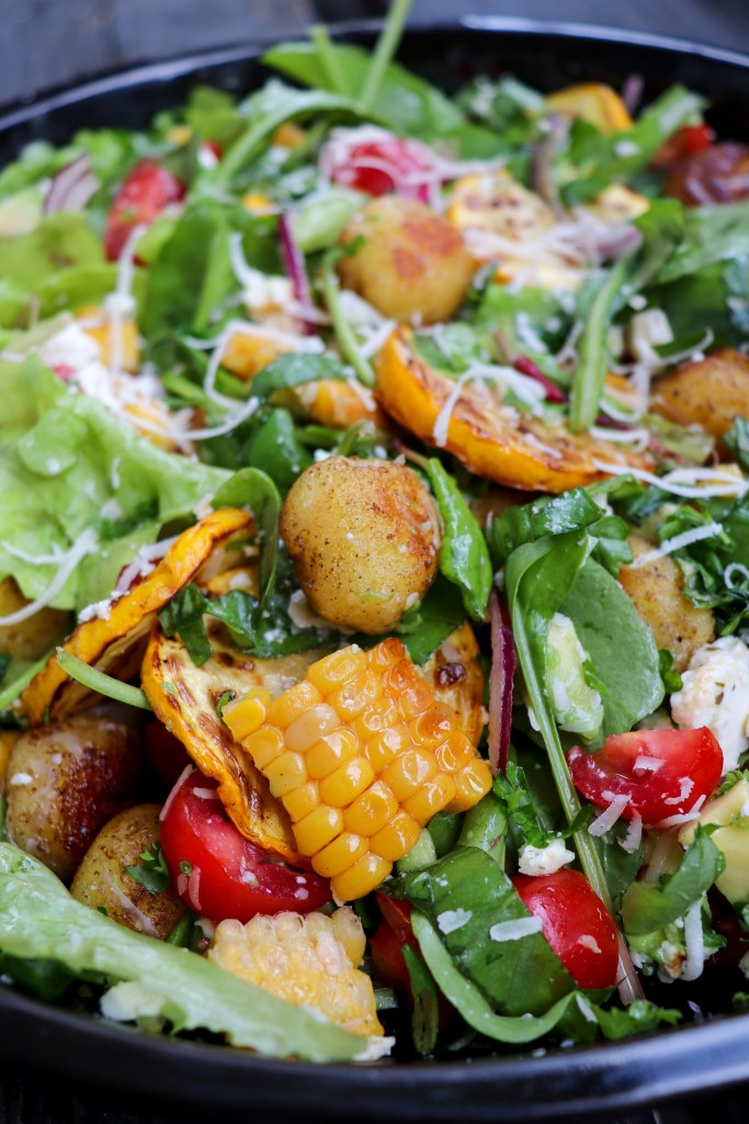 Deze heerlijke maaltijdsalade is perfect voor een zondagavond met een wit wijntje van de Frysling erbij. Het is een goed gevulde vegetarische salade met verschillende groenten, kruiden en kaas waarbij je het stukje vlees zeker niet mist.
