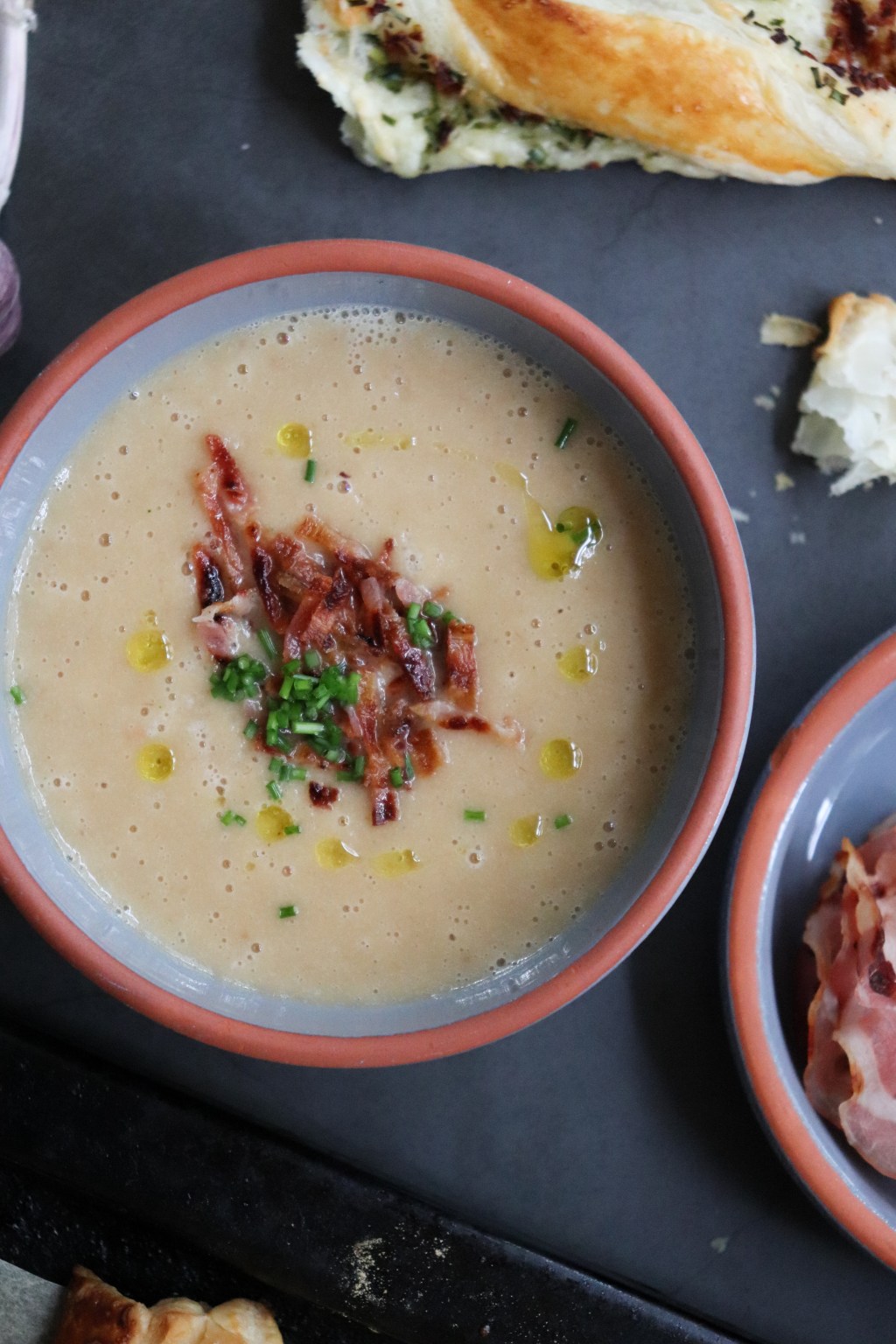 Bak de ontbijtspek uit en snijd het in kleine reepjes. Snijd ook de bieslook fijn en voeg de ontbijtspek en de bieslook als laatste toe aan de soep.