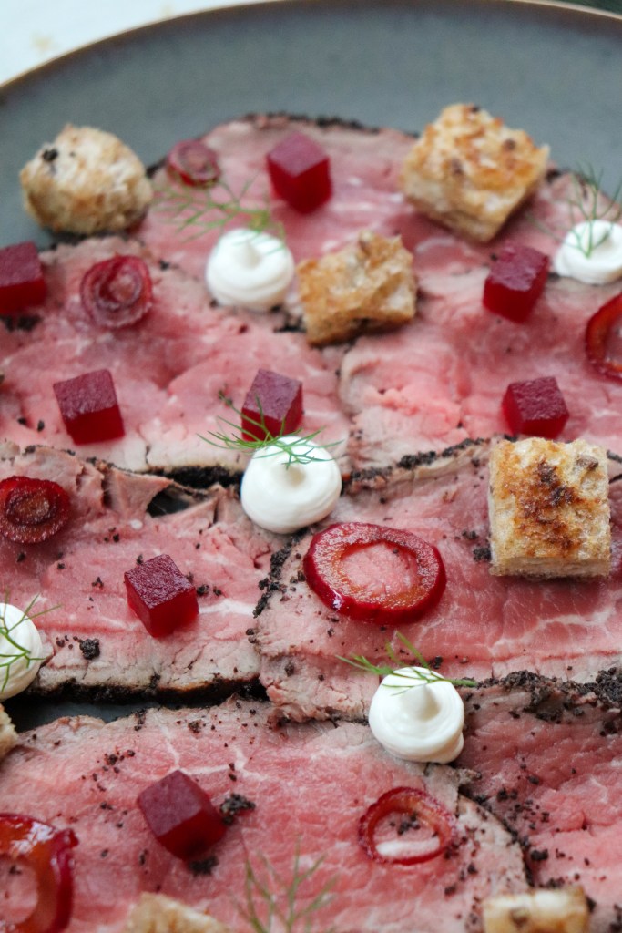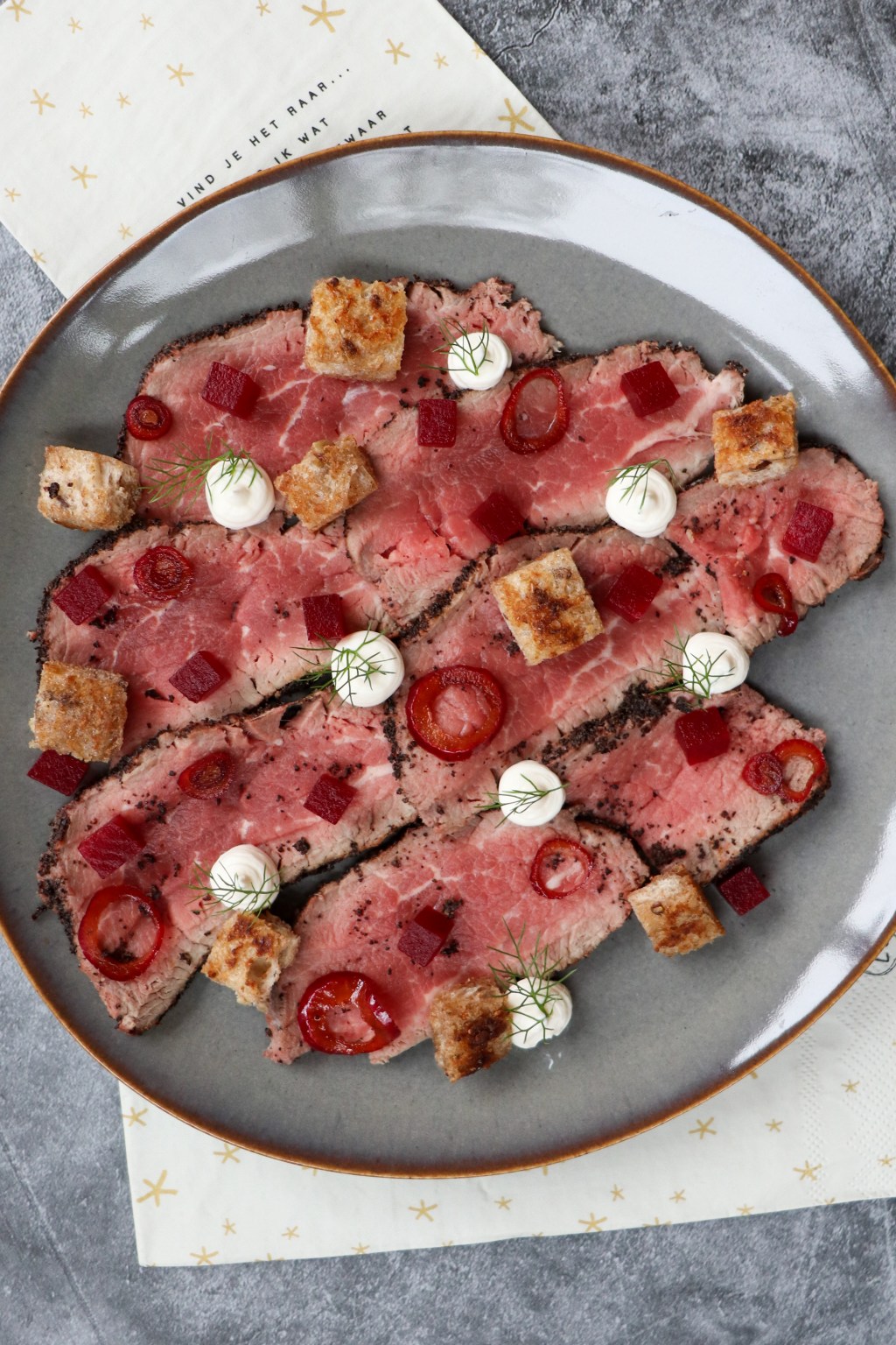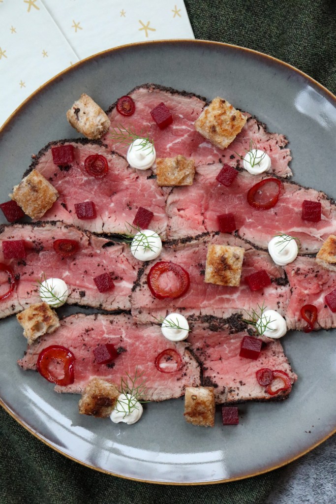 Een heerlijk voorgerechtje om met Kerst te serveren: een licht gerookte koffiecarpaccio met gemarineerde uitjes en crème fraîche.