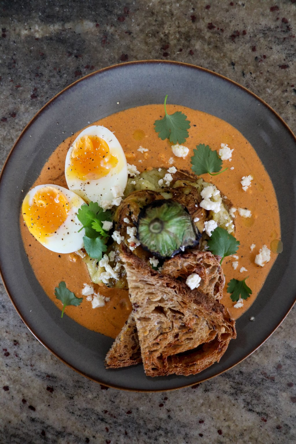Doe de grilplaat in de barbecue. Zodra hij warm is, rooster je de boterhammen op de grilplaat. Verdeel de paprika-feta dip, de aubergine en de eieren over de twee borden. Als laatste strooi je er nog een beetje verse koriander overheen. Serveer de borden met het brood.