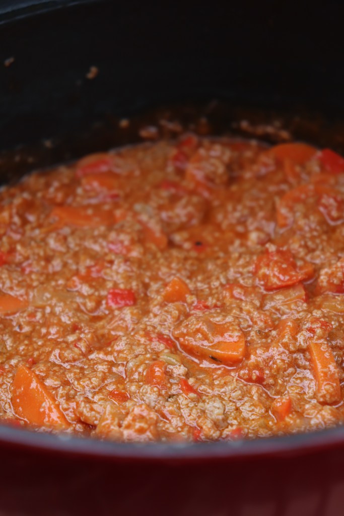 Snijd de wortels, ui, paprika en knoflook fijn. Fruit de groenten in een grote braadpan in de zonnebloemolie. Voeg daarna het gehakt, de tomato frito, de gedroogde kruiden en harissa toe en laat het zachtjes doorpruttelen tot het gehakt gaar is.