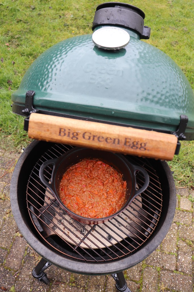 Natuurlijk kun je de saus gewoon op het fornuis maken maar ik raad je aan de braadpan op de Big Green EGG – met de convEGGtor ertussen – te zetten zodat je een extra lekkere smaak aan je saus krijgt. Breng de barbecue naar een temperatuur van 150 graden.