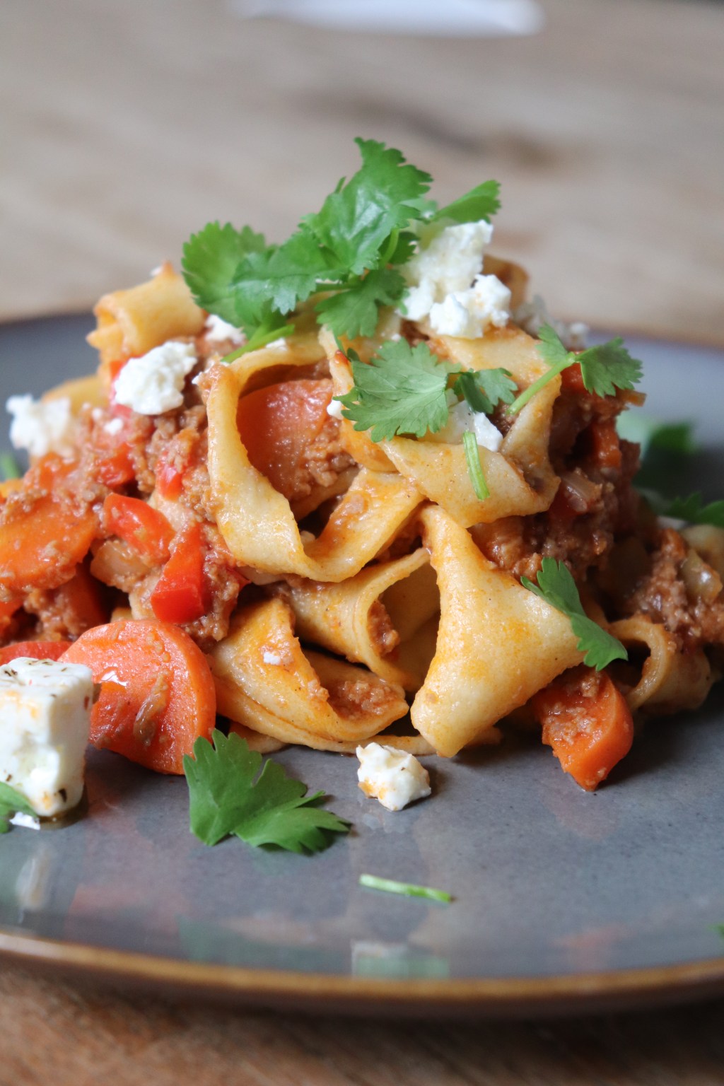 Deze pasta bolognese is eigenlijk een heerlijk kruidige variant van de Italiaanse pasta bolognese. Warme kruiden zoals komijn en kaneel zijn perfect voor op een frisse lentedag.