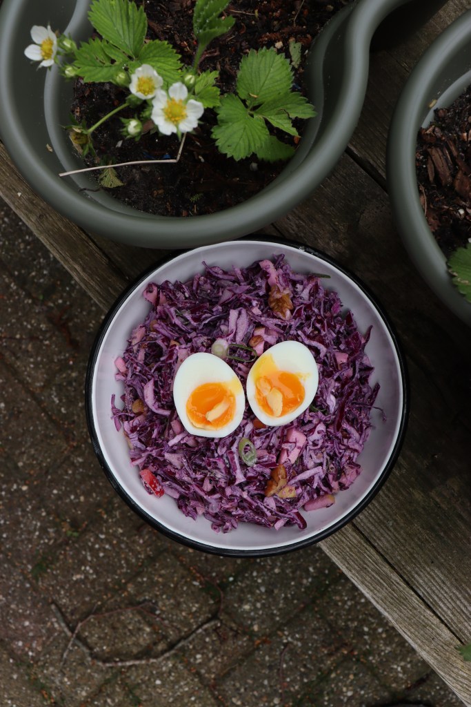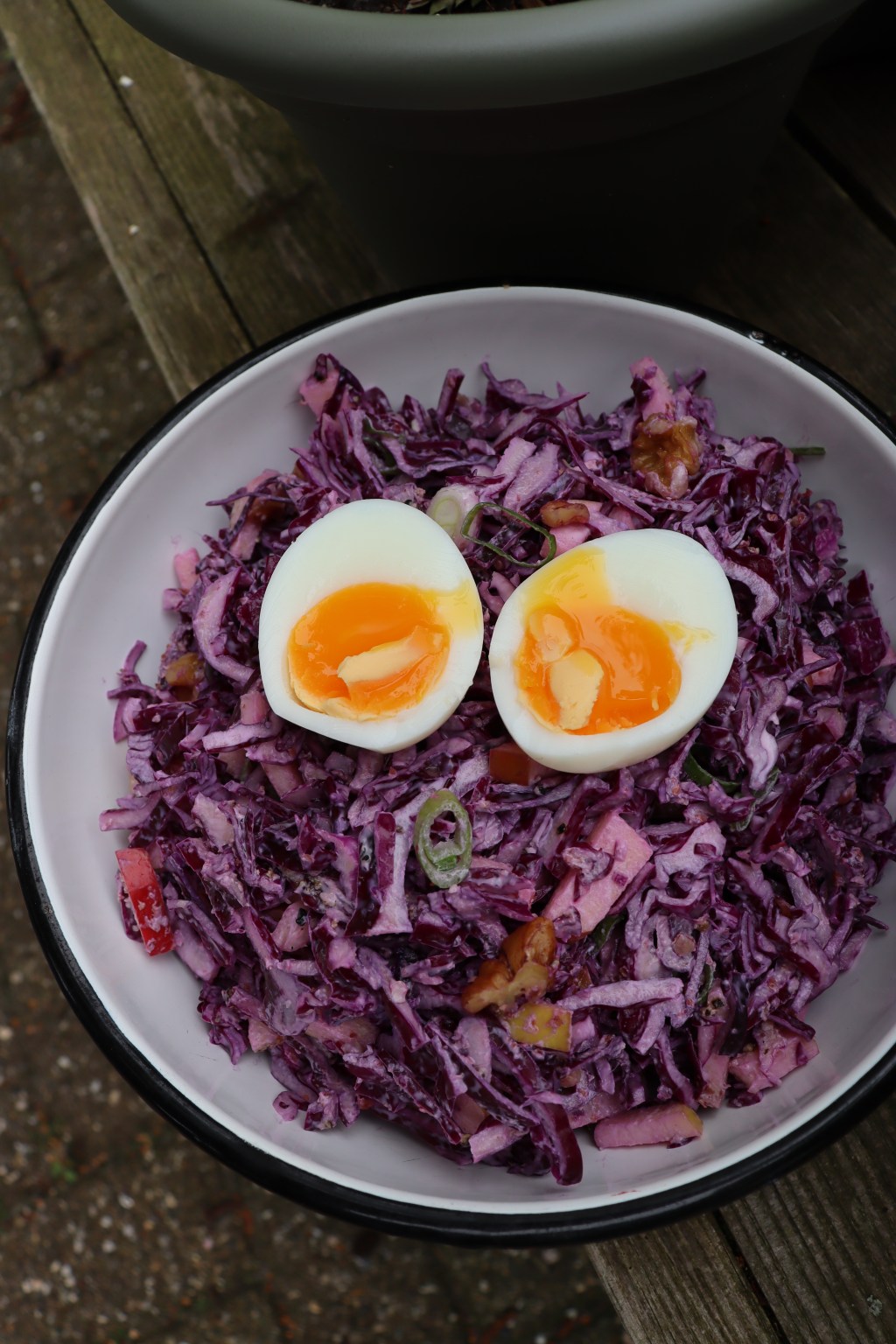 Maak rode koolsalade door de eieren en de appel in kleine blokjes te snijden, de ui in dunne ringen en de bieslook fijn. Meng daarna alle ingrediënten door elkaar. Breng het op smaak met peper en zout.