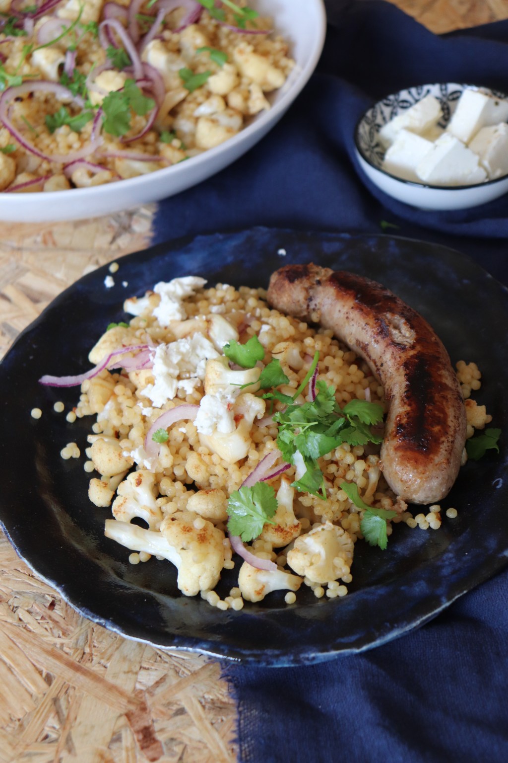 Snijd de ui in ringen en de koriander en peterselie fijn. Meng bloemkool, ui, koriander, peterselie en feta door de couscous en serveer de venkelworstjes ernaast.