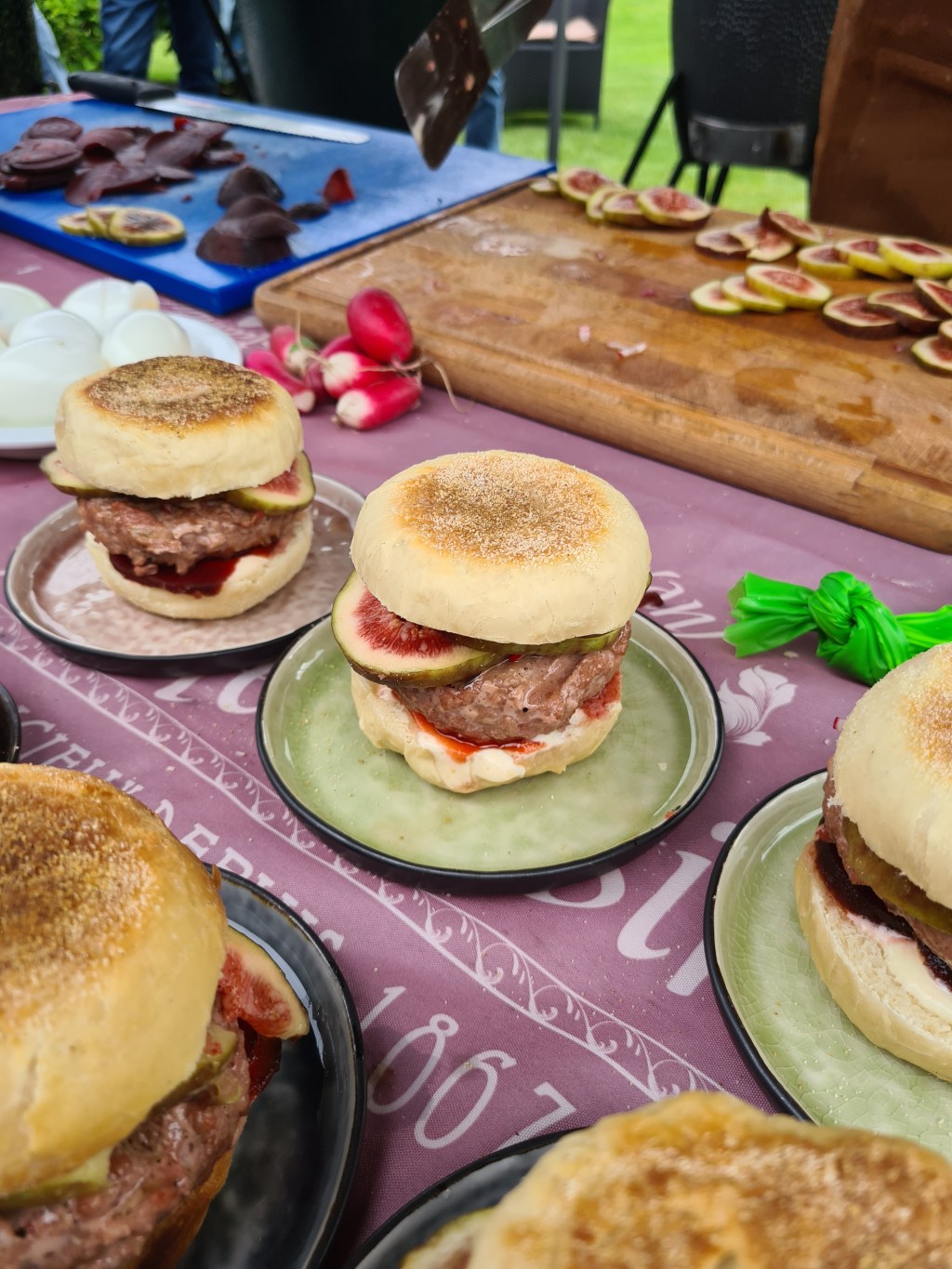 Bak de burgers en de Engelse muffin op de Arteflame. De eendenborstfilet mag nog wel een beetje rood zijn van binnen. Snijd ondertussen de vijgen en de rode biet in dunne plakjes. Meng de bosui door de crème fraîche.
