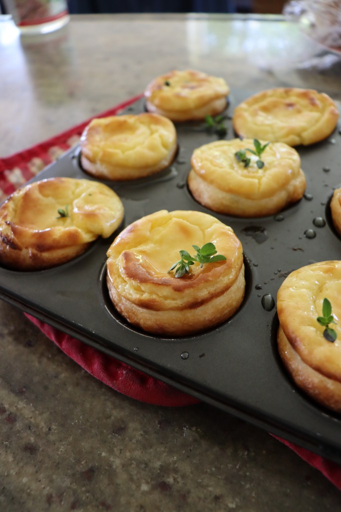 Rol het bladerdeeg uit, verdeel de helft van de tijm over het bladerdeeg en rol het bladerdeeg weer op. Snijd de rol in twaalven en druk het deeg in de muffinvormpjes. Zet ze daarna in de koelkast