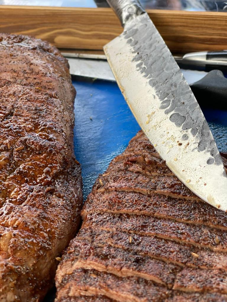 Grill daarna de Flat iron steak kort op hoog vuur, zodat hij mooi donker is van buiten maar nog rood van binnen. Wil je met een kernthermometer werken houd dan een kerntemperatuur van 50 graden aan.