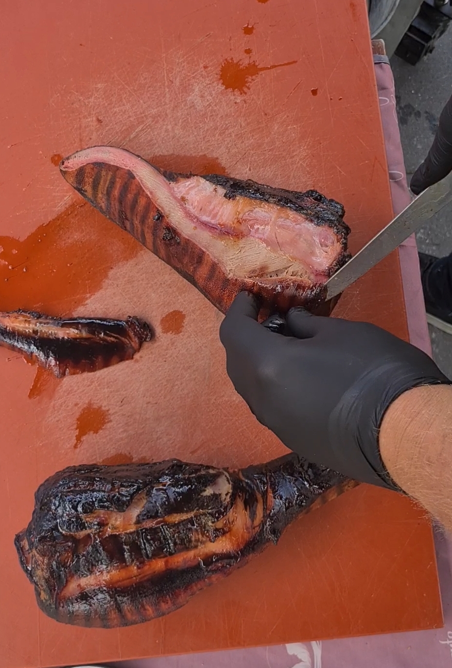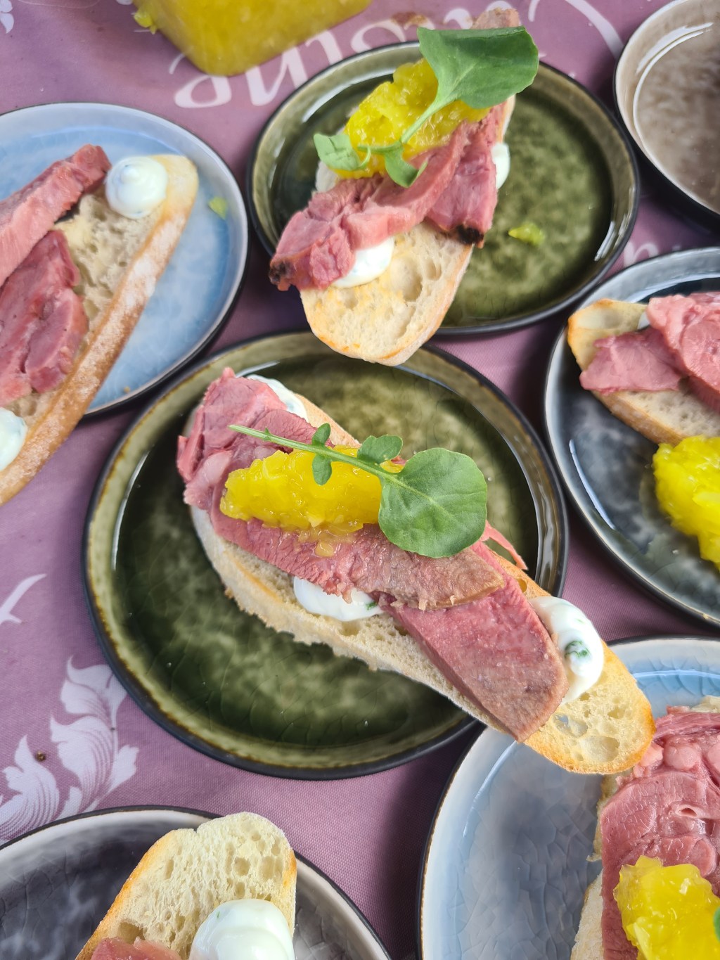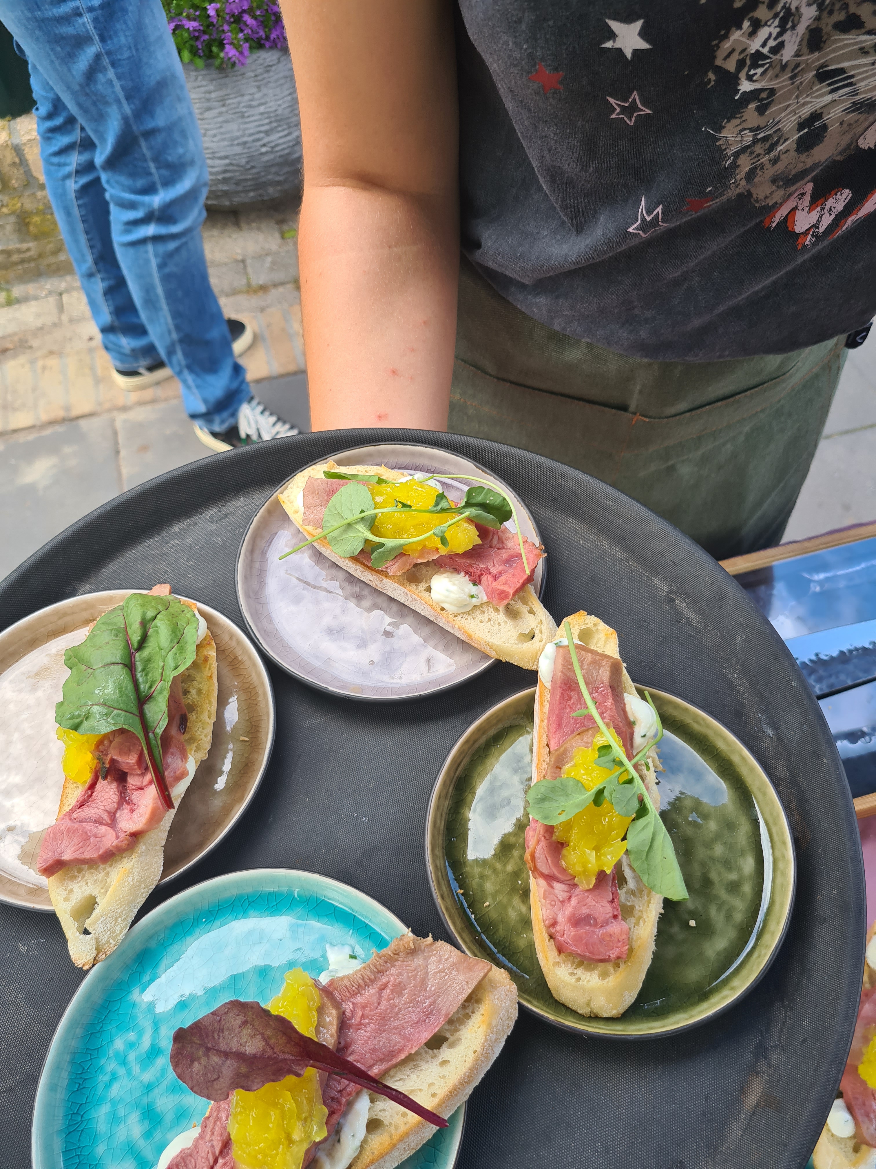 Wanneer de tong 6 uur op de barbecue heeft gelegen, haal je hem er vanaf en snijd je dun de harde buitenkant eraf. Snijd de tong in dunne plakken en verdeel het over de toastjes. Doe op alle toastjes een beetje bieslookhangop en relish van de Amsterdamse uitjes en de toastjes zijn klaar om opgegeten te worden.