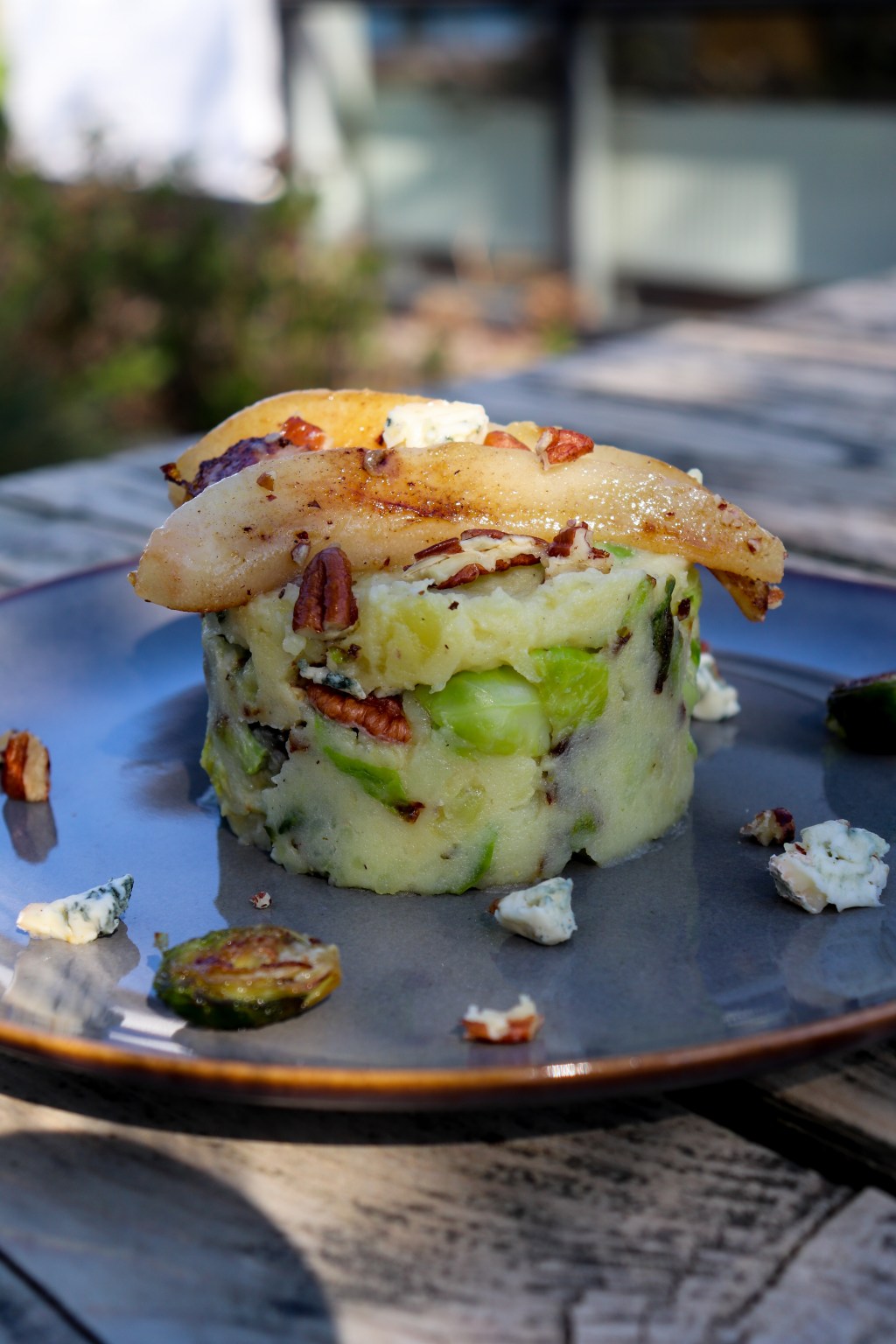 Meng de peer, spruitjes en gorgonzola door de aardappelpuree en breng het, indien nodig op smaak met peper en zout. Stooi net voor het opdienen de pecannoten over de stampot heen.