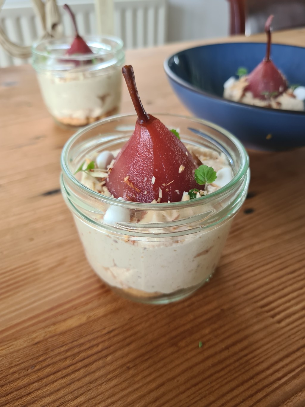 Haal de potjes uit de koelkast en haal de deksels eraf. Haal het klokhuis van onder uit de peertjes en zet de peertjes boven op de mousse. Maak hem daarna af met gekruimelde dumkes, eiwitschuimpjes en atsina cress.