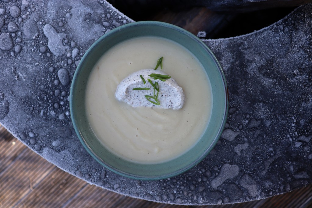 Verdeel de soep over de kommen en doe in elke kom een grote lepel truffelslagroom. Strooi er nog een beetje fijngesneden bosui over en de soep is klaar om geserveerd te worden.