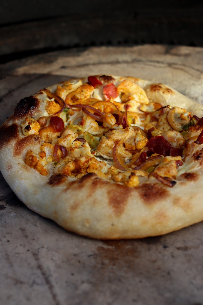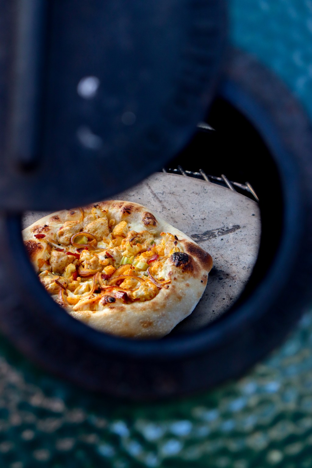 Doe de pizza ongeveer 10 minuten in barbecue op de pizzasteen of tot hij mooi knapperig gebakken is.