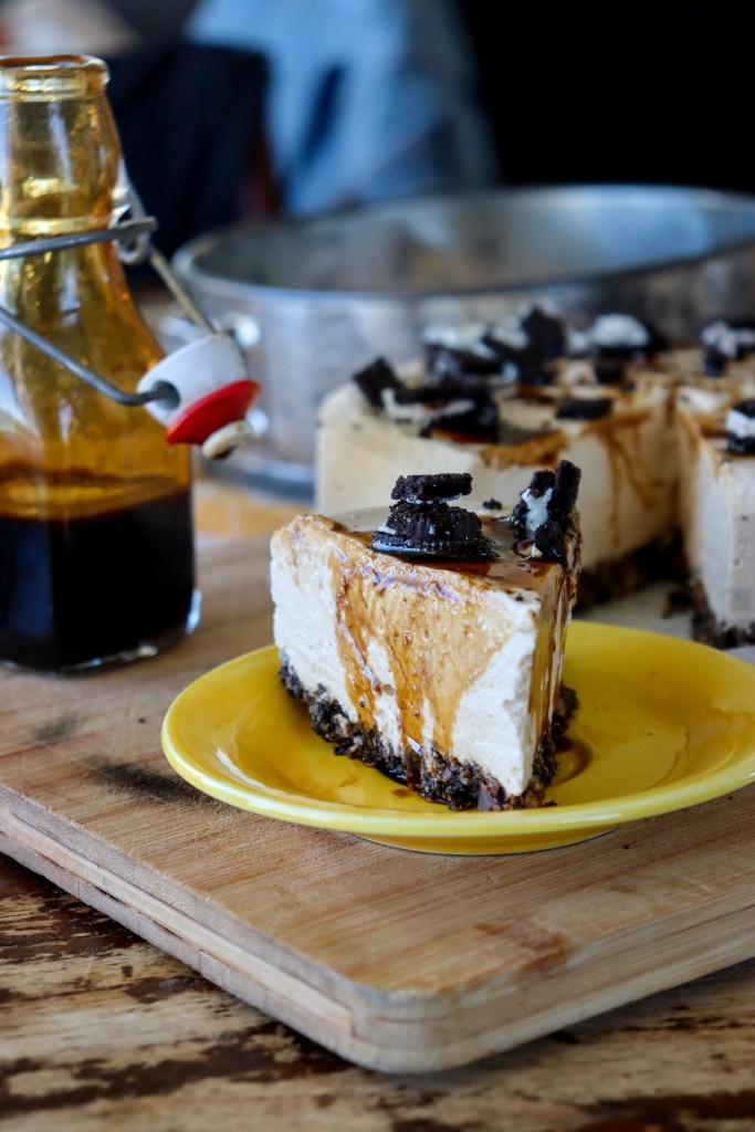 Haal de springvorm om de taart wel en giet de siroop over de taart. Breek de oreokoekjes in kleine stukjes en verdeel ze over de taart.