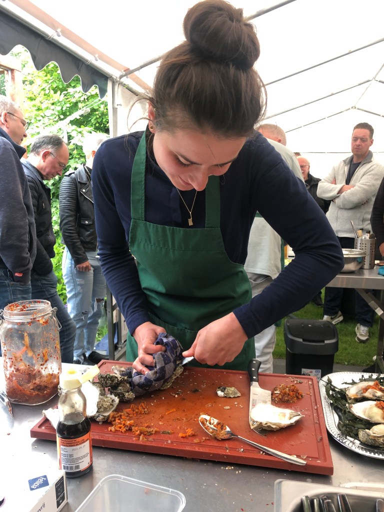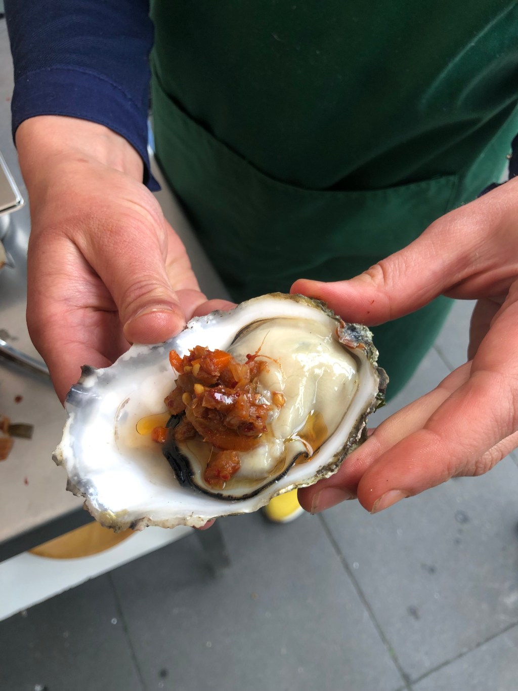 Deze oesters hebben we kort op de barbecue gegrild waardoor ze een beetje open gaan staan en ze garen, waardoor de oesters iets steviger worden. Zelf vind ik de structuur en smaak van de oesters zo veel lekkerder. Deze oesters hebben we gegarneerd met kimchi en sesamolie
