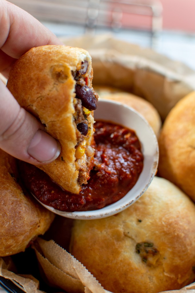 Deze heerlijke zachte bolletjes hebben een pittige gehaktvulling. Lekker om te eten bij de lunch op zondag, maar ook leuk om ’s avonds te serveren als snack bij een borrel.